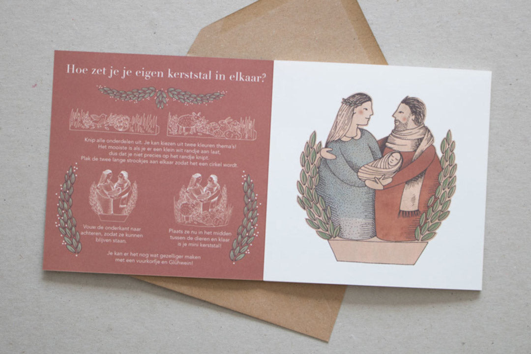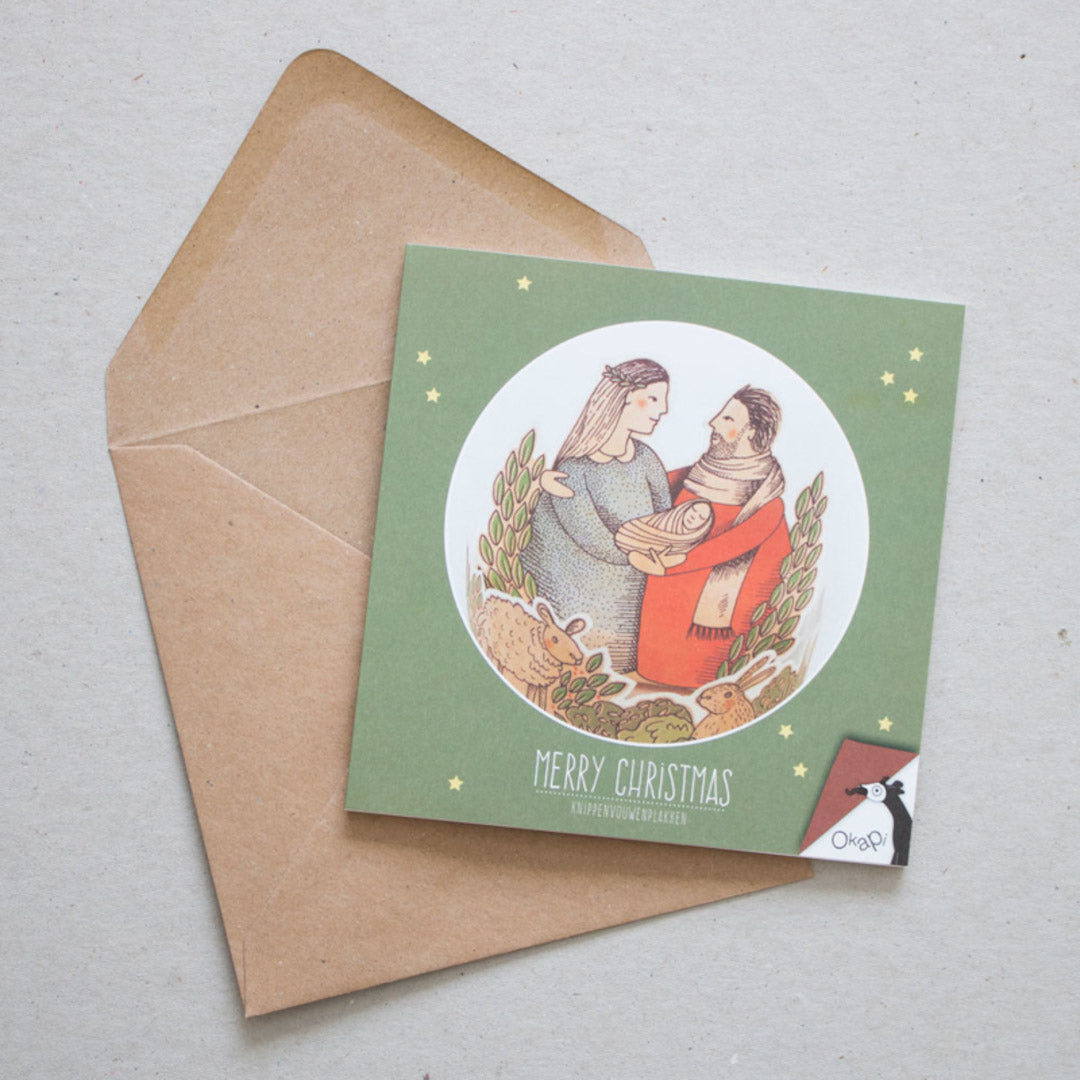 Knip, vouw en plak je eigen minikerststal in elkaar! Een Merry Christmas kerstkaart met nét een beetje extra. Deze Okapi kaart is geïllustreerd door Studio Het Paradijs en uitgegeven door uitgeverij Loopvis.