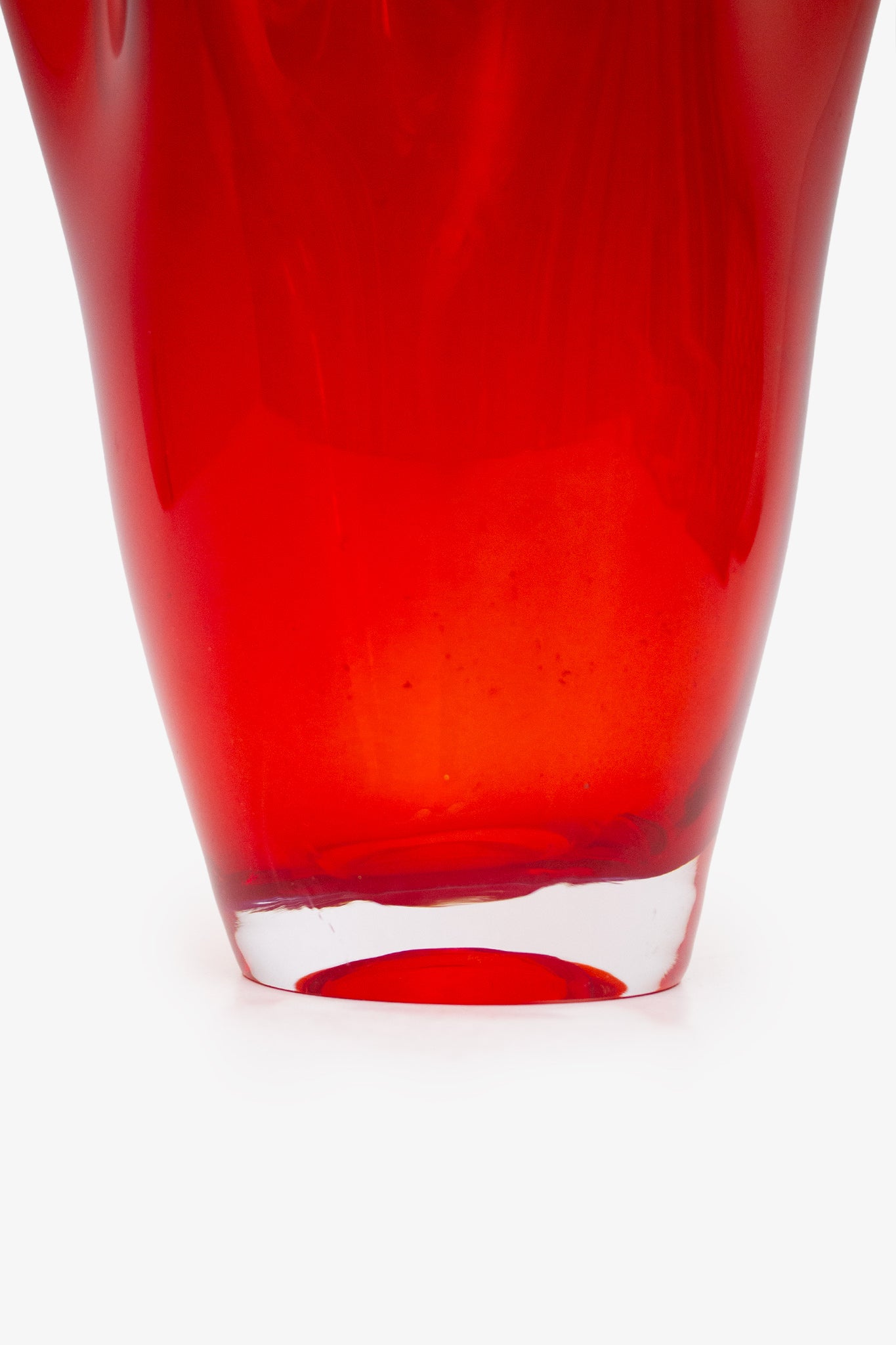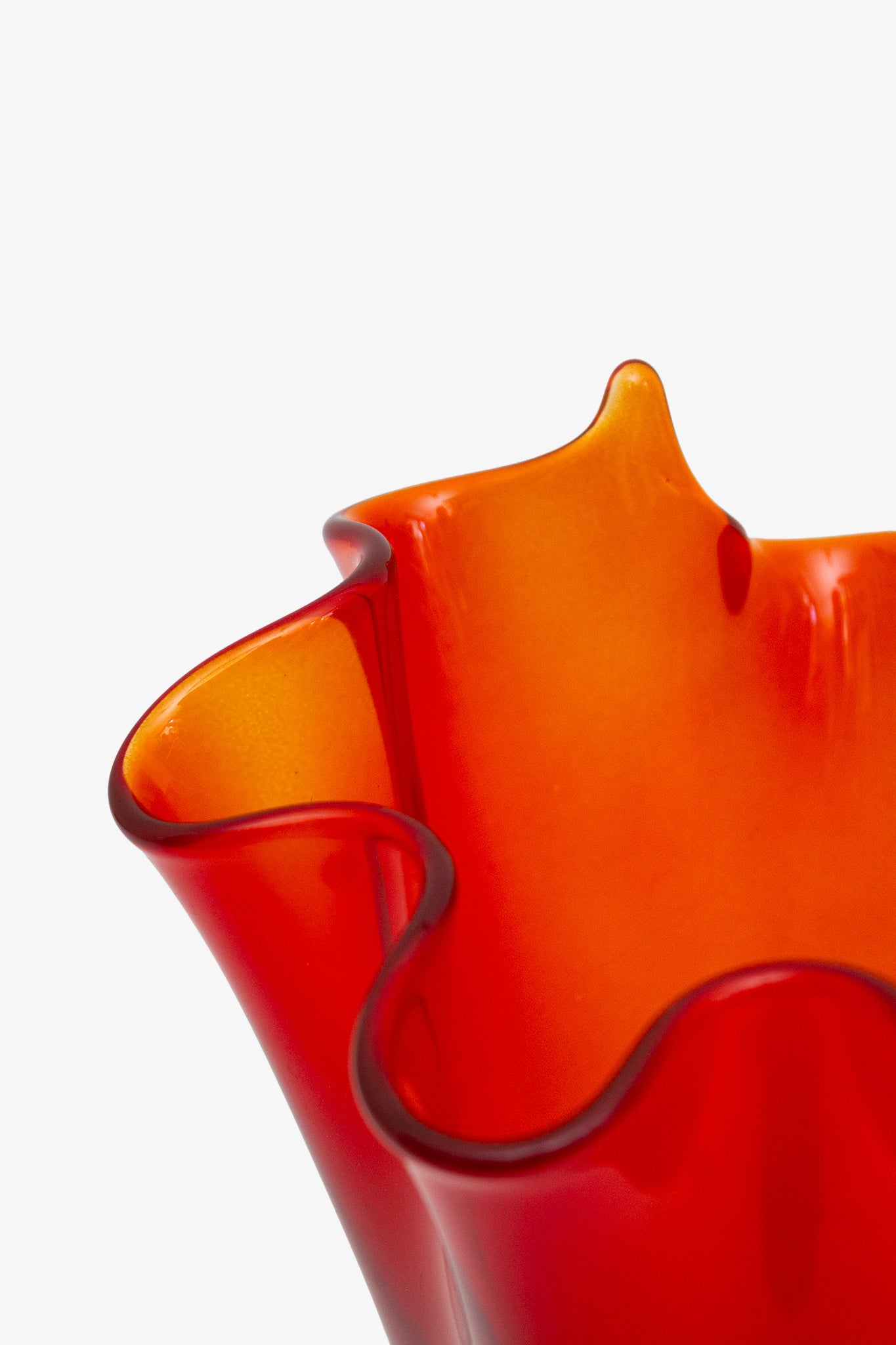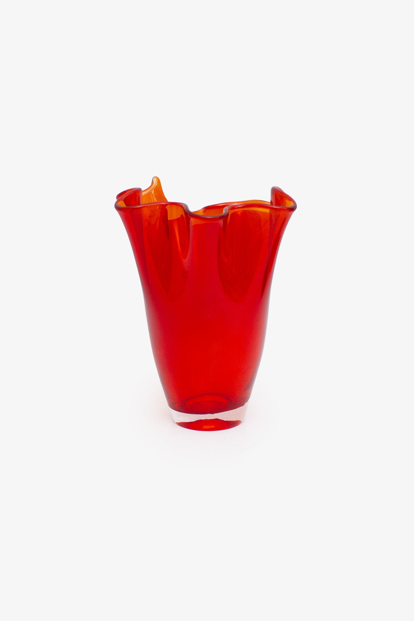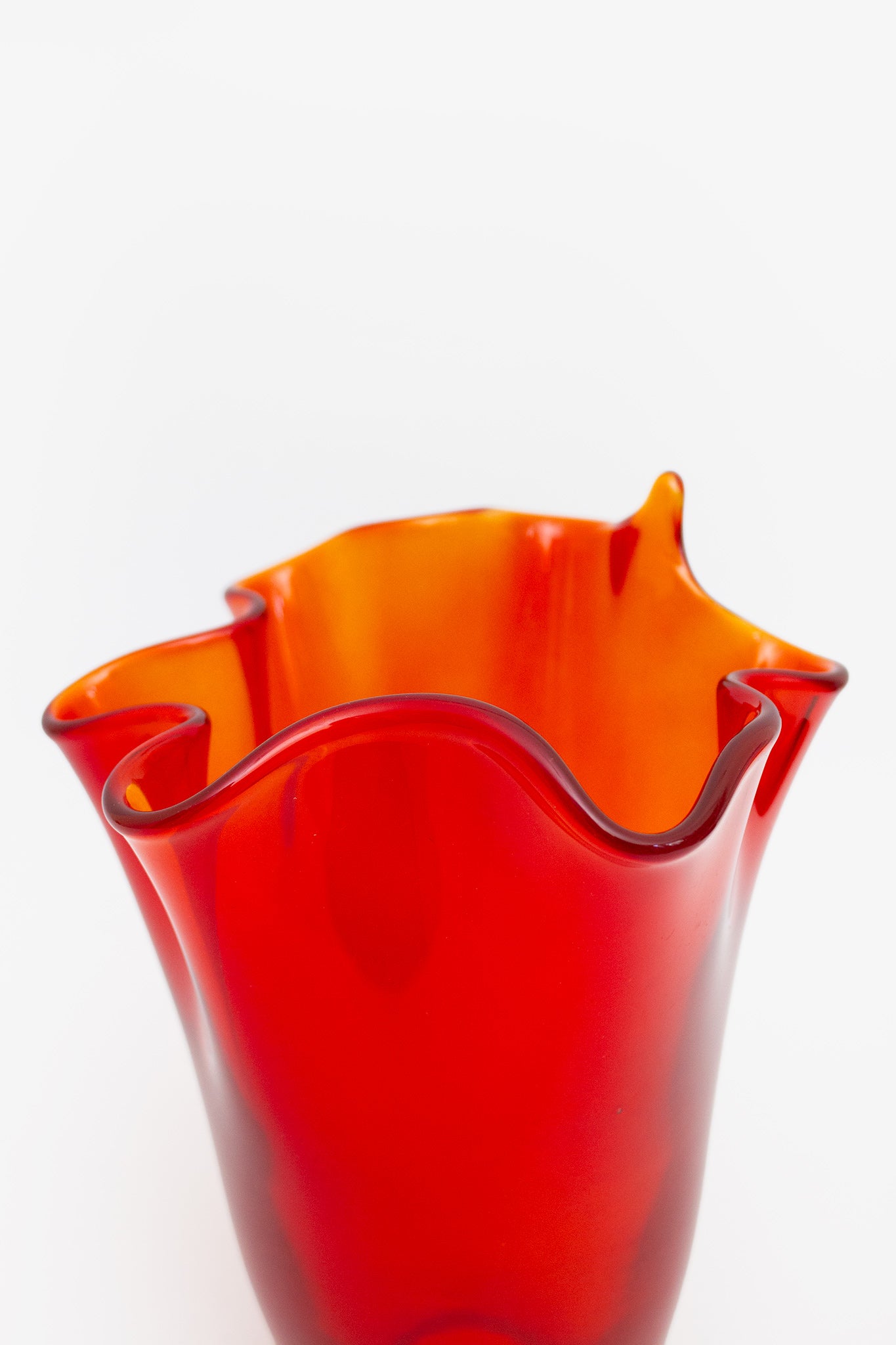 Alsof er een vlam is bevroren in glas! Prachtige vintage handgeblazen glazen vaas gemaakt omstreeks de jaren 70. Door de speels opkrullende gegolfde rand, spreken we ook wel van een servetvaas. Zowel met als zonder bloemen is deze knalrode vaas een plaatje om te zien.
