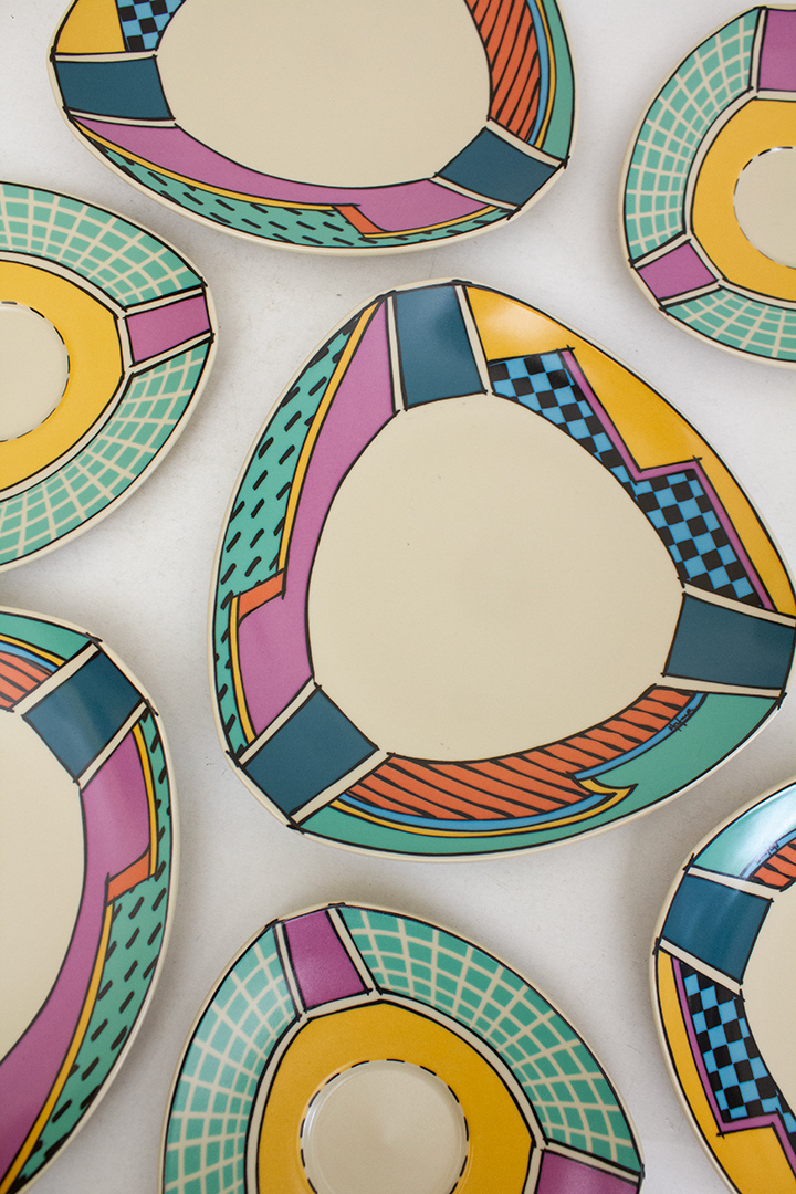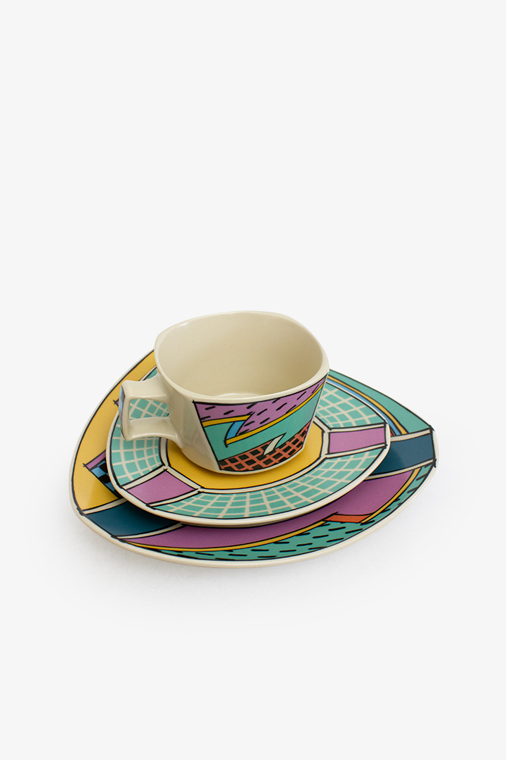 Dit waanzinnig 80’s Pop-art servies komt uit de exclusieve studio line Flash One, uitgebracht door Rosenthal en ontworpen door Dorothy Hafner. Het servies bestaat uit een 4 kopjes, 4 schotels en 4 ontbijtborden. De Flash (bliksemschicht) is een terugkerende thematiek binnen het servies en wordt afgewisseld met verschillende patronen die gebaseerd zijn op de kunststroming Pop-art. De opdruk maar ook de vormen van het servies zelf doen meteen denken aan kunstenaars als Andy Warhol en Roy Lichtenstein. De serviesstukken zijn op zichzelf staand dus ook al ware kunstwerkjes!