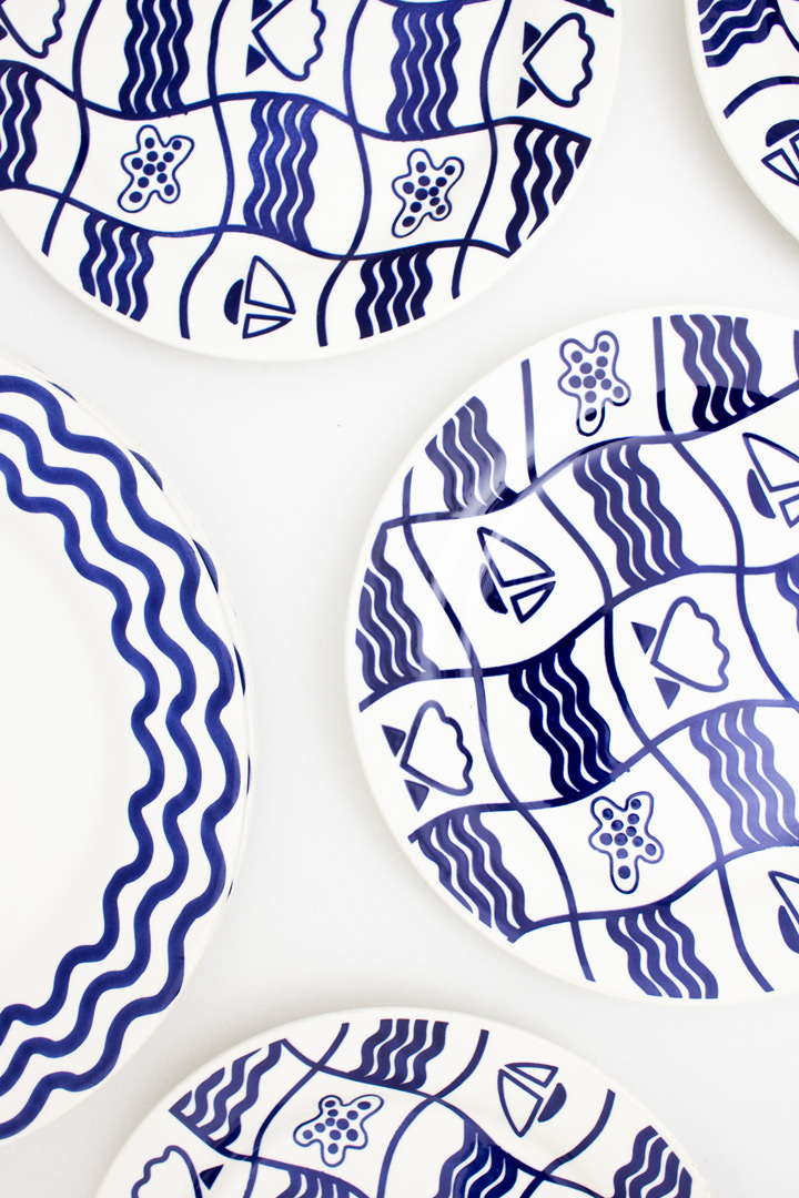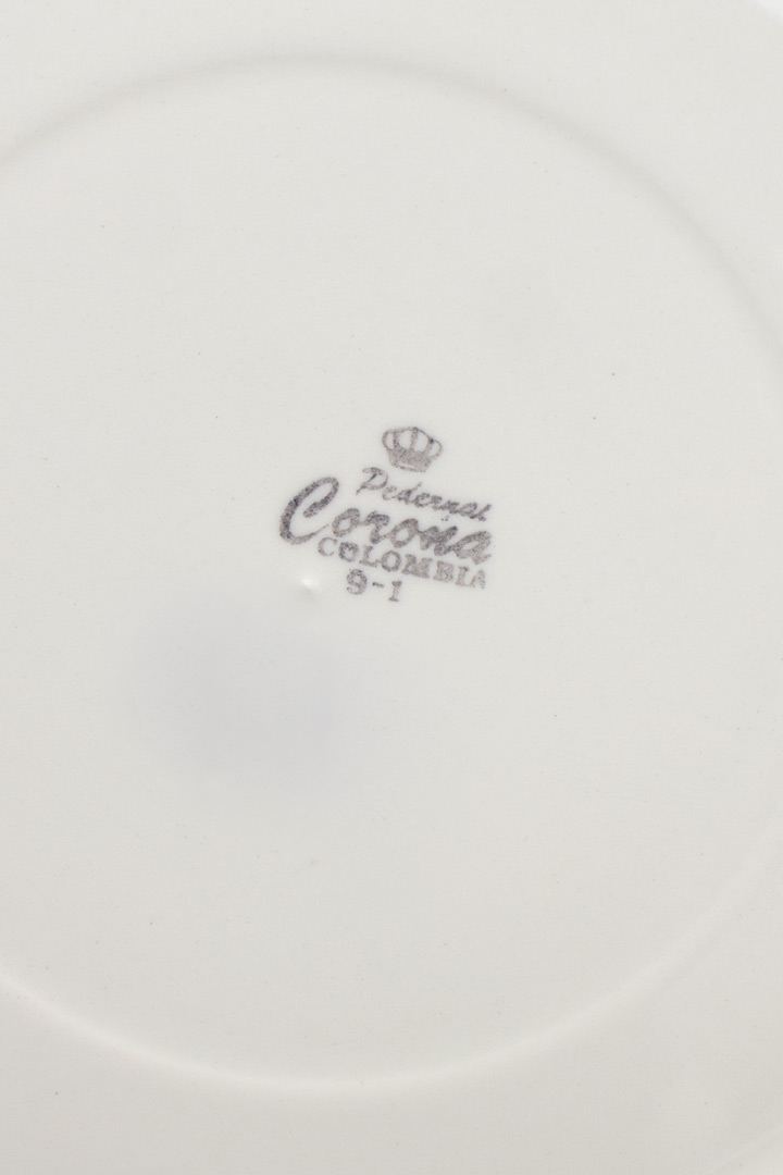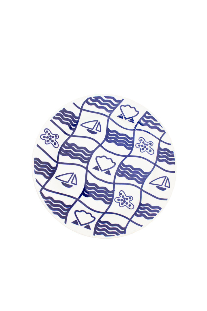 Mooi vintage servies setje bestaande uit 3 grote en 15 kleine (diner en ontbijt) borden. De 18-delig set borden hebben een leuk, speels design met een “zee” thema. De borden zijn gemerkt Corona Colombia en hebben elk een helder witte basis en levendige donkerblauwe tekening.