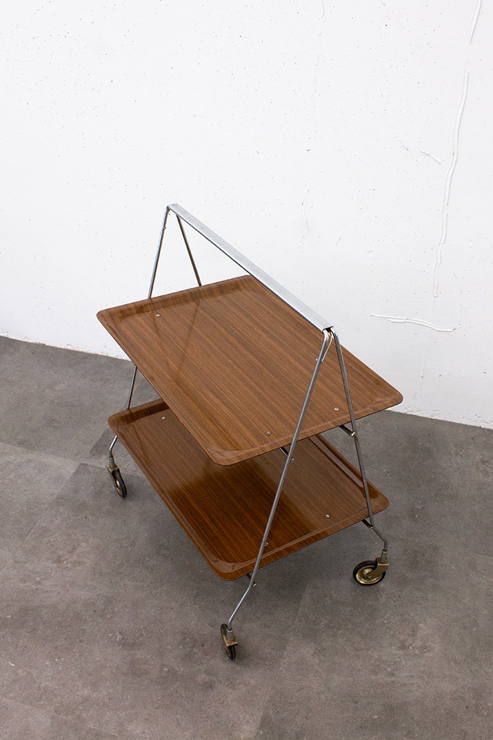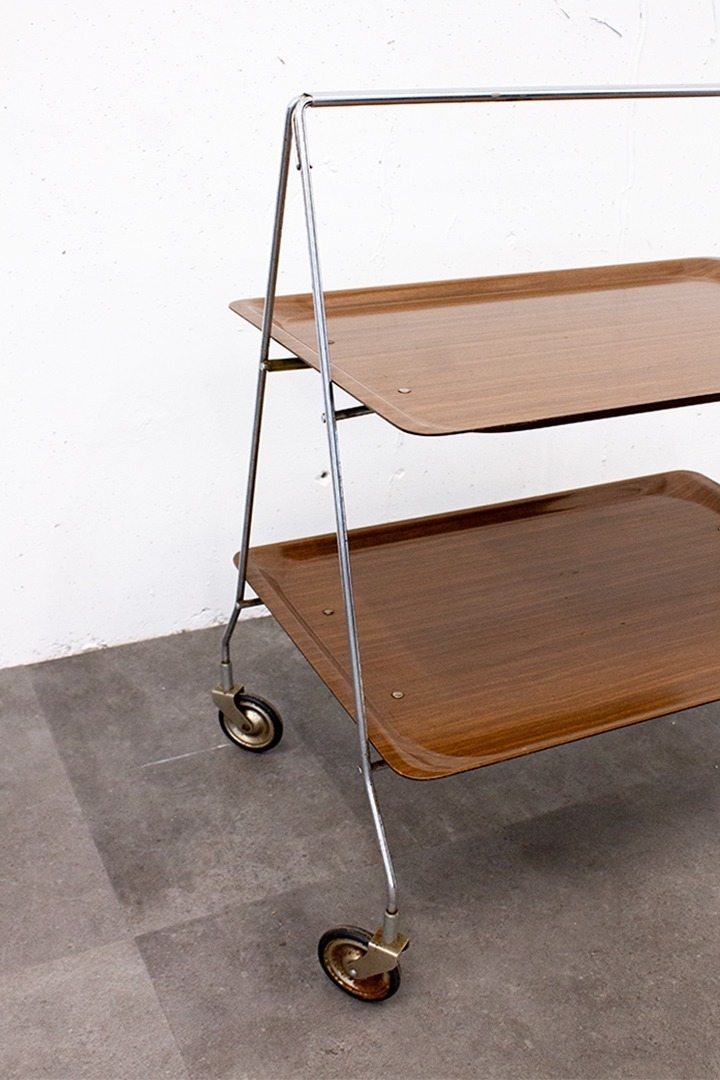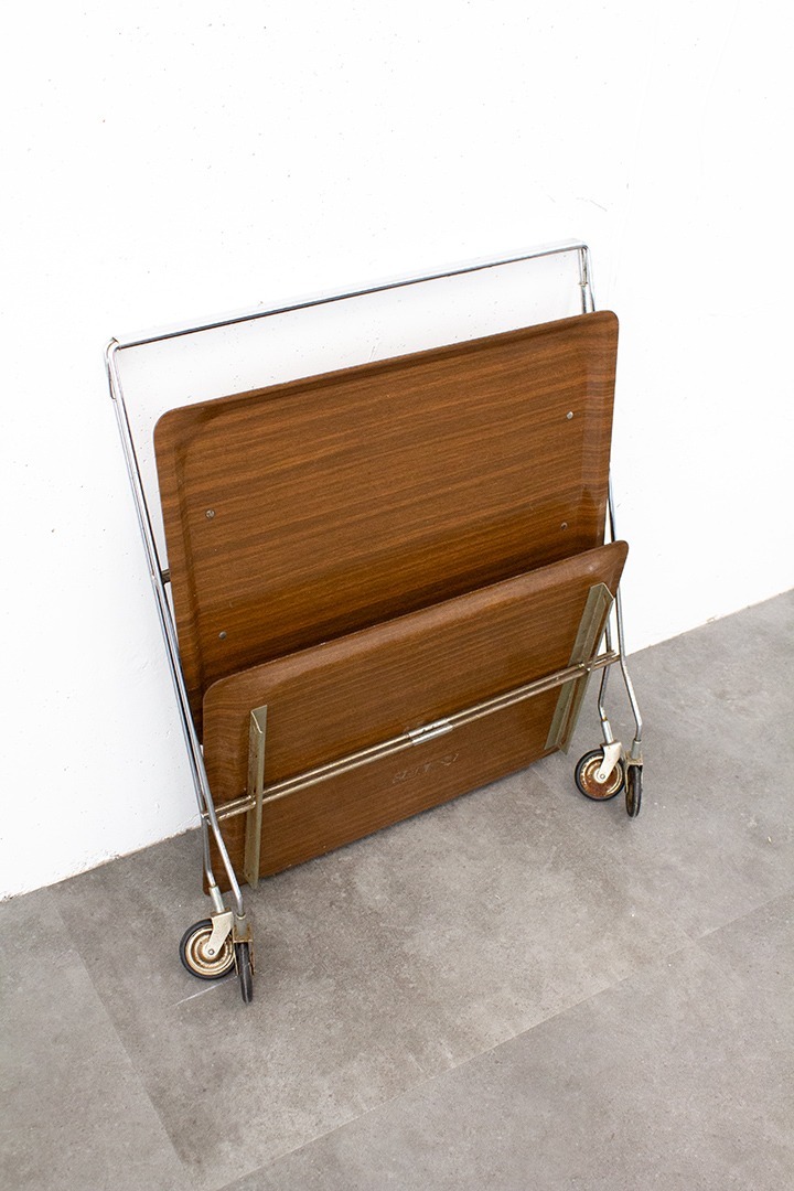 Deze charmante trolley uit de jaren 70 is prachtig afgewerkt met twee trays van melamine (imitatie hout). De serveerwagen is heel gemakkelijk in gebruik, de wieltjes doen het nog goed en de wagen is volledig plat op te vouwen door de inklapbare bladen. Je kunt de trolley natuurlijk gebruiken als serveerwagen, maar het item misstaat ook niet als plantentafel of bijzettafeltje!