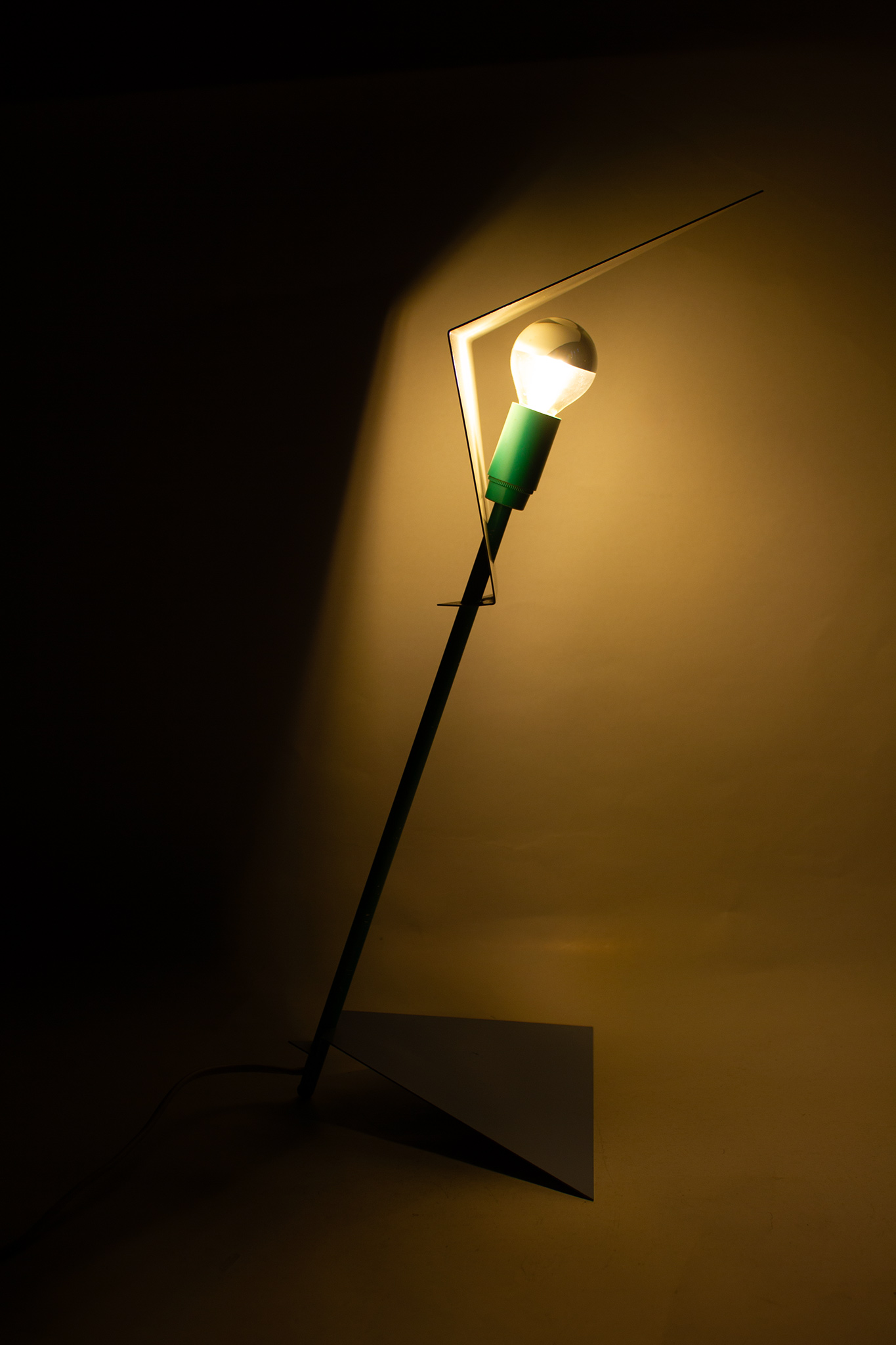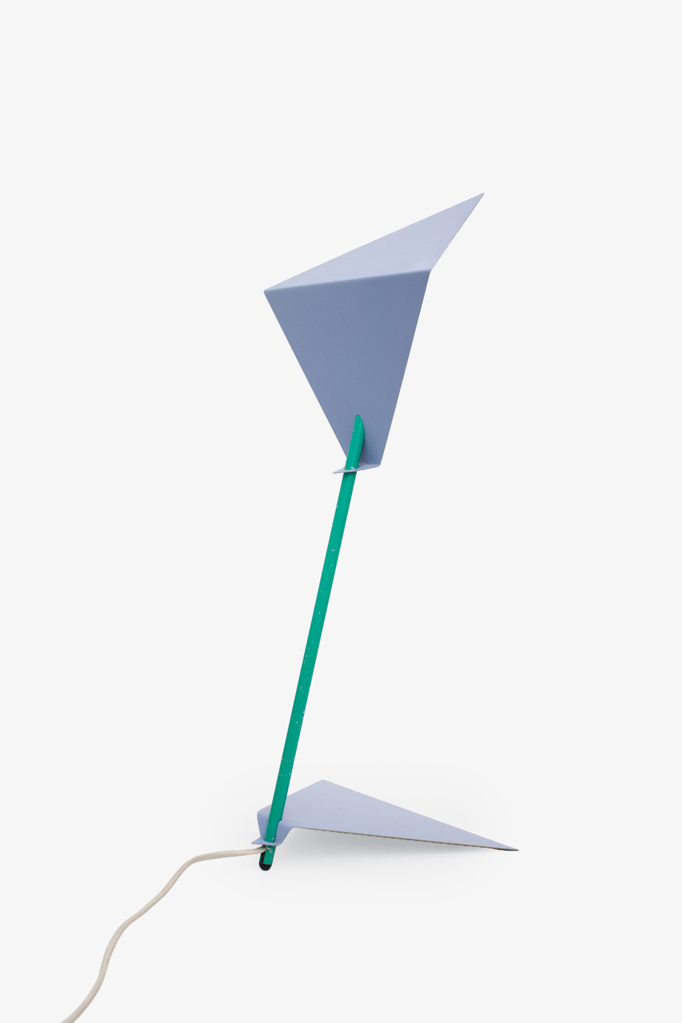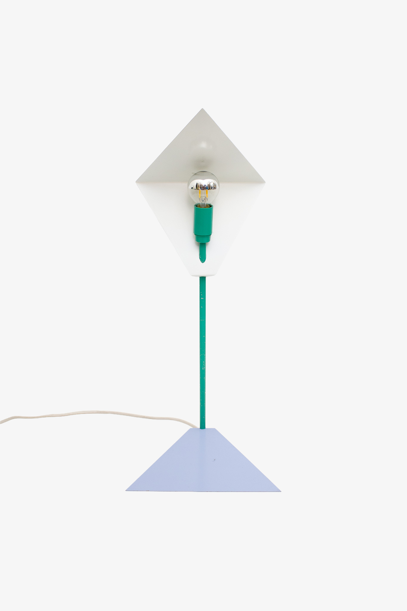 De prachtige lamp is uitgevoerd in 2 hoekige baby-blauwe platen die zijn bevestigd aan een turquoise steel. De onderplaat is los van de steel te verplaatsen, zodat de lamp licht kan kantelen. Een uniek stuk dat moeiteloos te combineren is in een vintage of modern interieur!