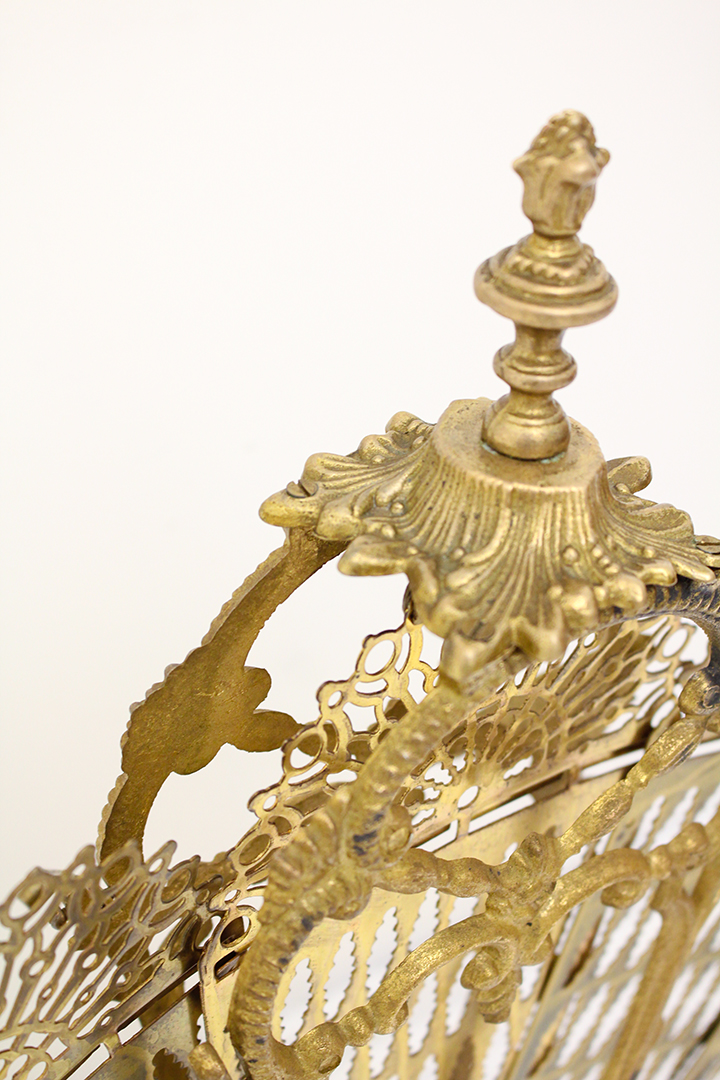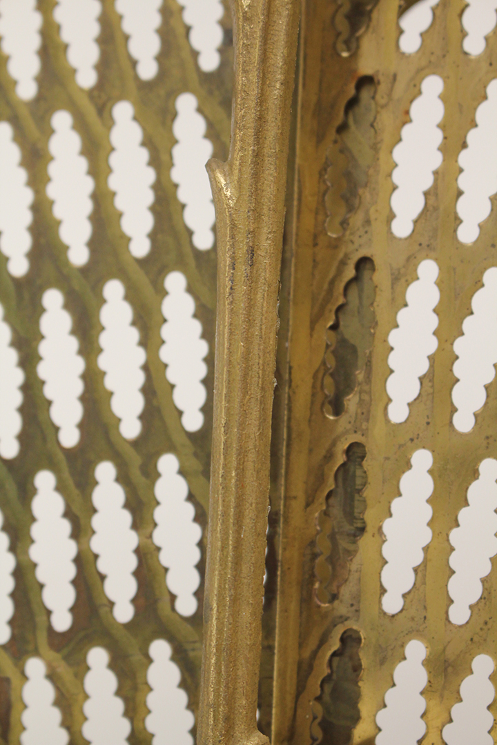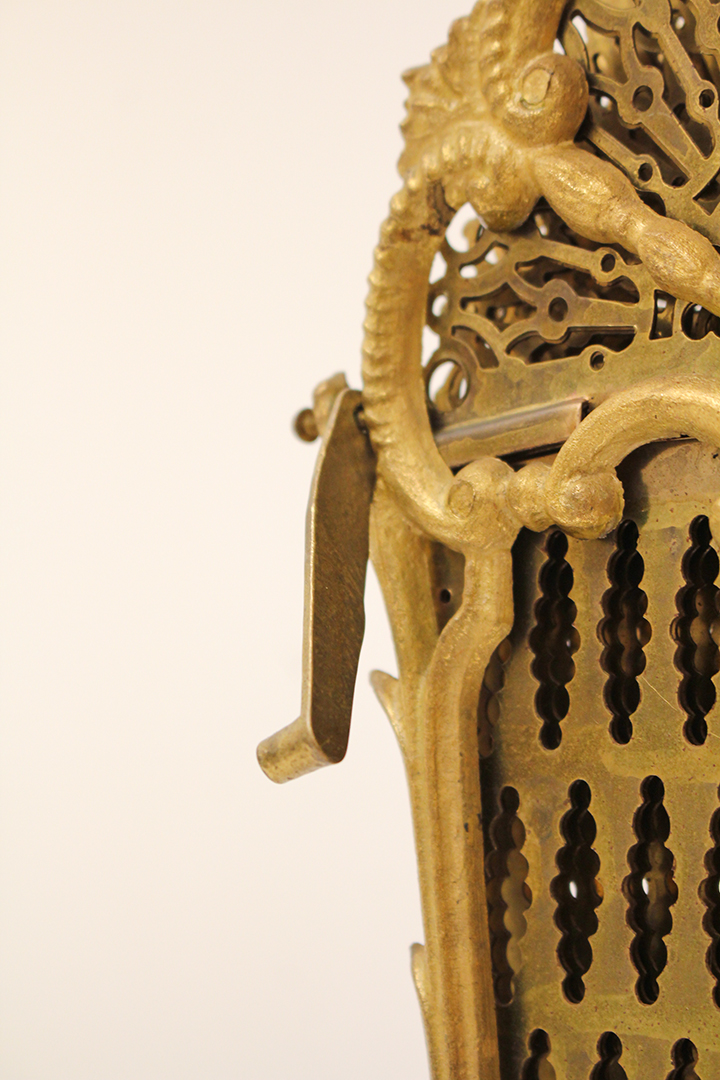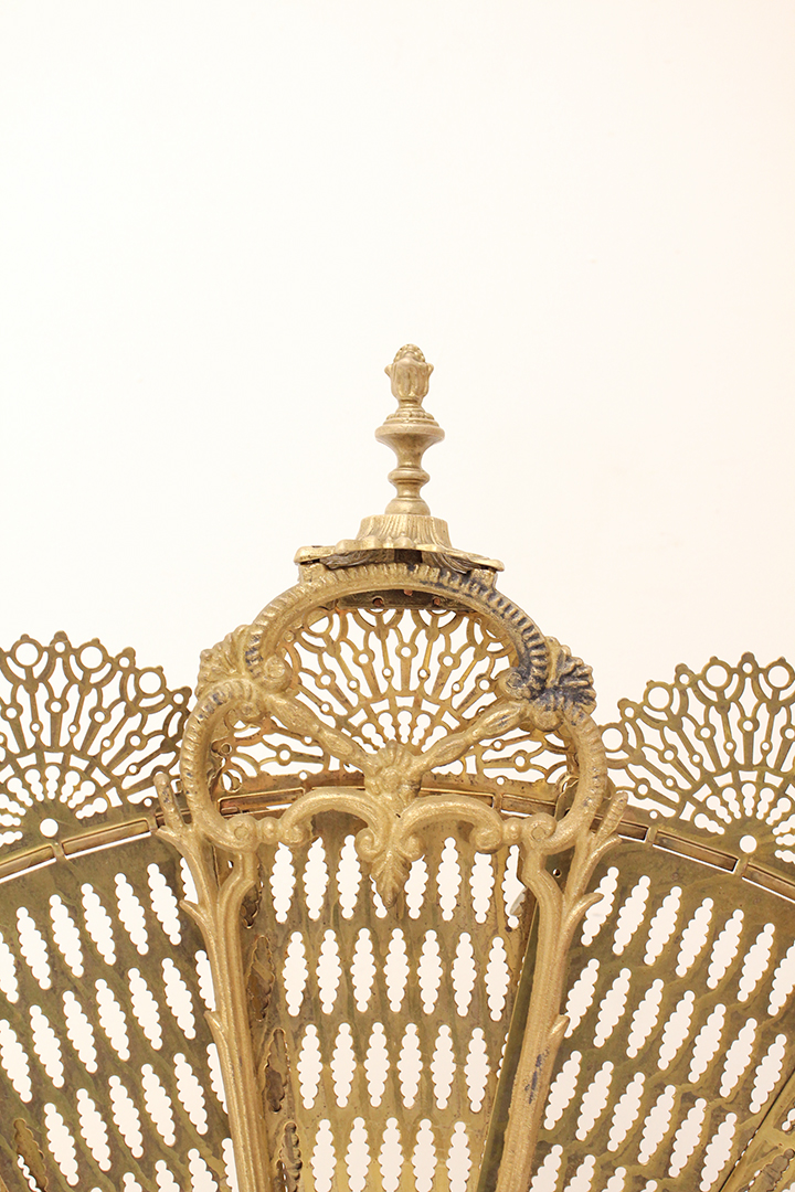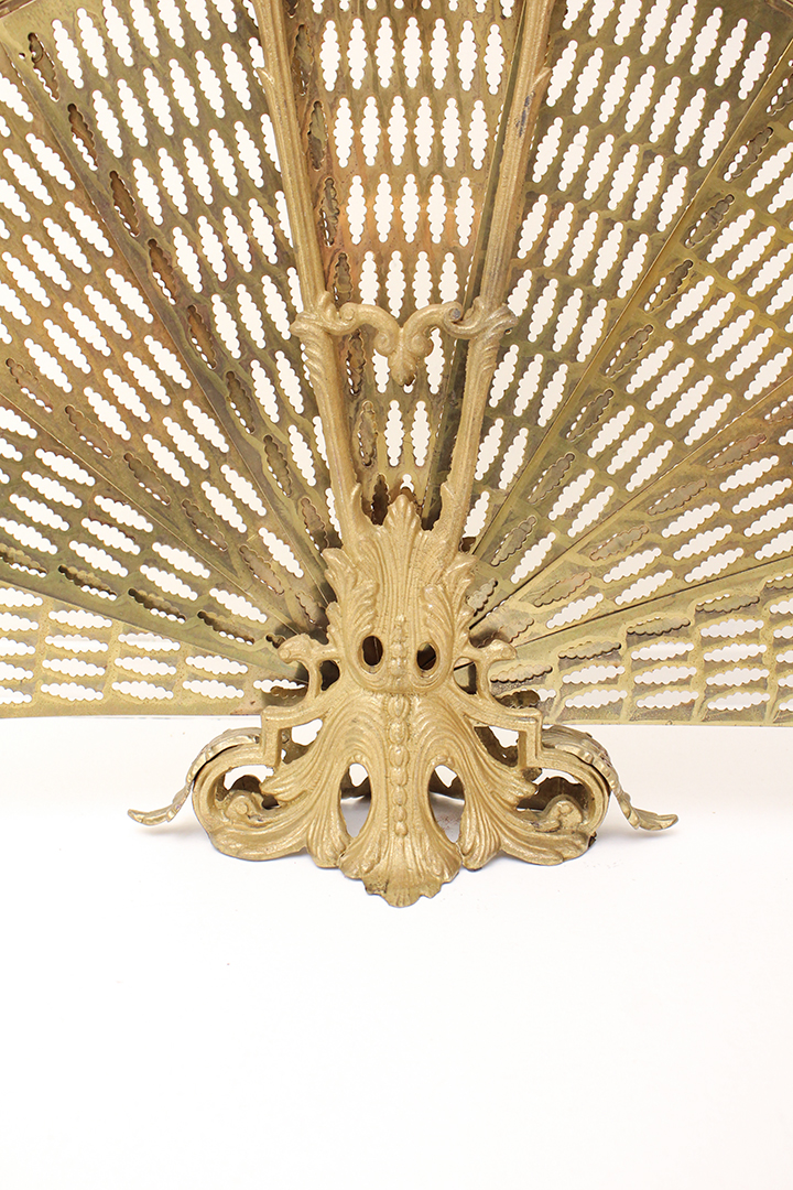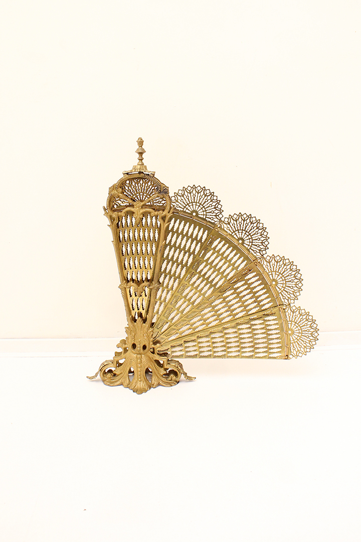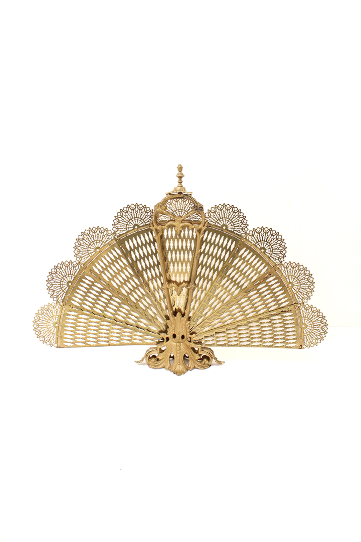 Het ontwerp van dit openhaardscherm doet denken aan een pauw. Het haardscherm is antiek en vermoedelijk gemaakt rond de jaren 1900. De ‘vleugels’ van het scherm zijn opengewerkt en voorzien van sierlijke halve cirkels. Ook de voet is erg chique met mooie krullen. Haardschermen zoals deze zijn bedoeld om te plaatsen naast een open haard. Ze houden vonken tegen en zorgen ervoor dat kinderen of huisdieren niet zomaar bij het vuur kunnen komen.
