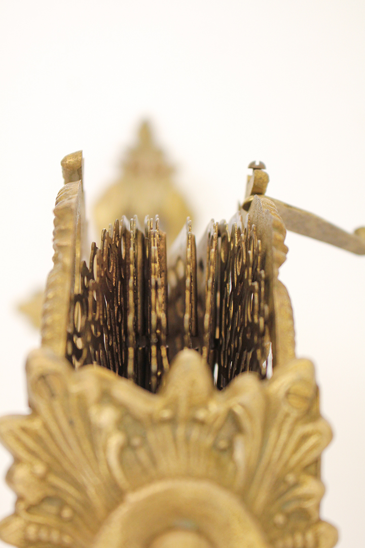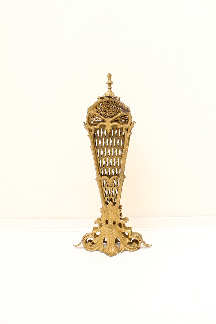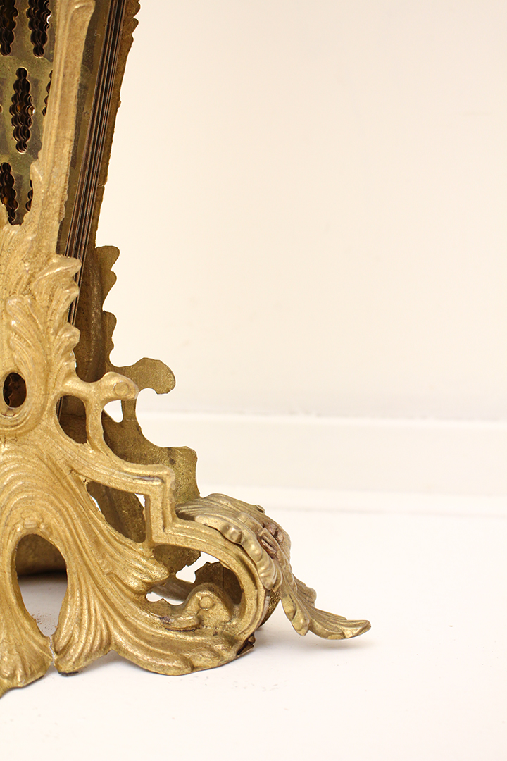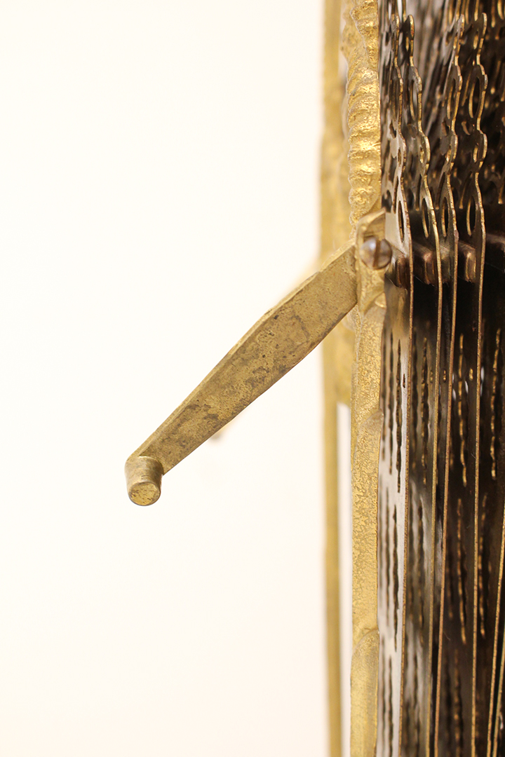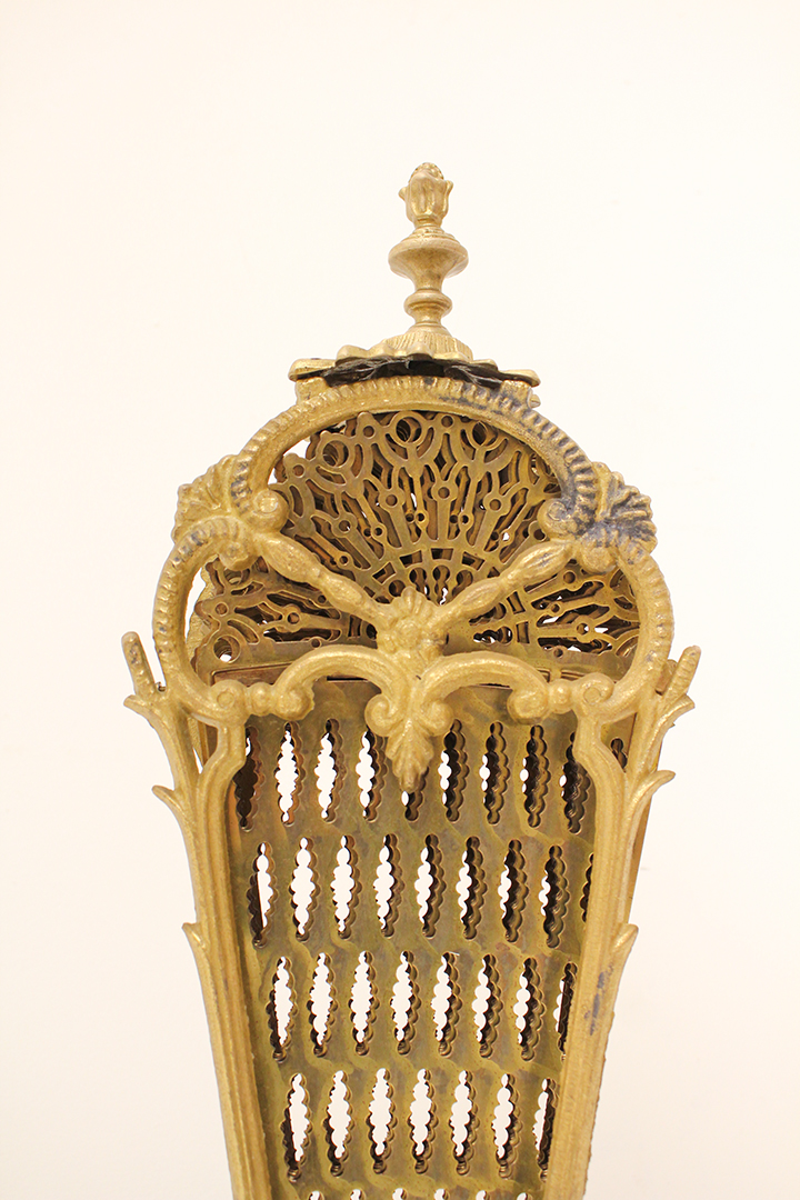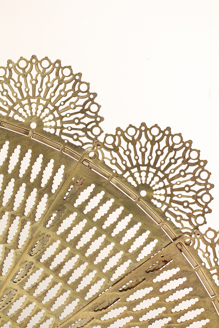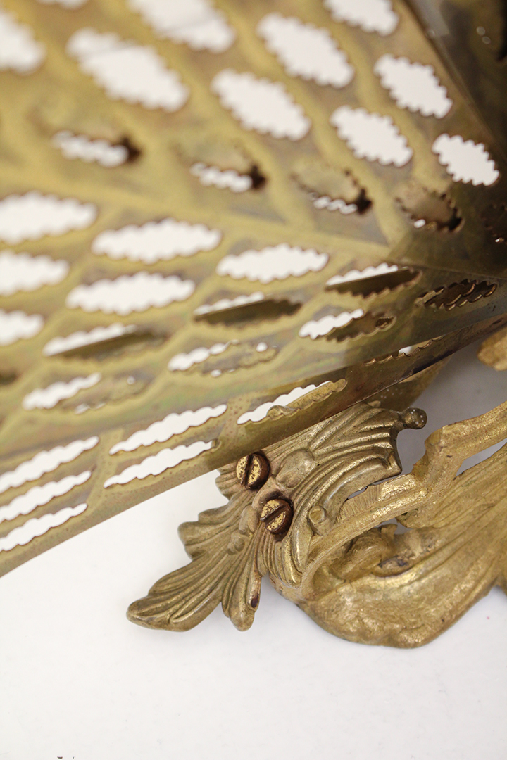 Het ontwerp van dit openhaardscherm doet denken aan een pauw. Het haardscherm is antiek en vermoedelijk gemaakt rond de jaren 1900. De ‘vleugels’ van het scherm zijn opengewerkt en voorzien van sierlijke halve cirkels. Ook de voet is erg chique met mooie krullen. Haardschermen zoals deze zijn bedoeld om te plaatsen naast een open haard. Ze houden vonken tegen en zorgen ervoor dat kinderen of huisdieren niet zomaar bij het vuur kunnen komen.