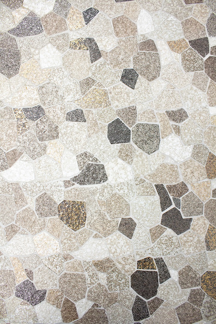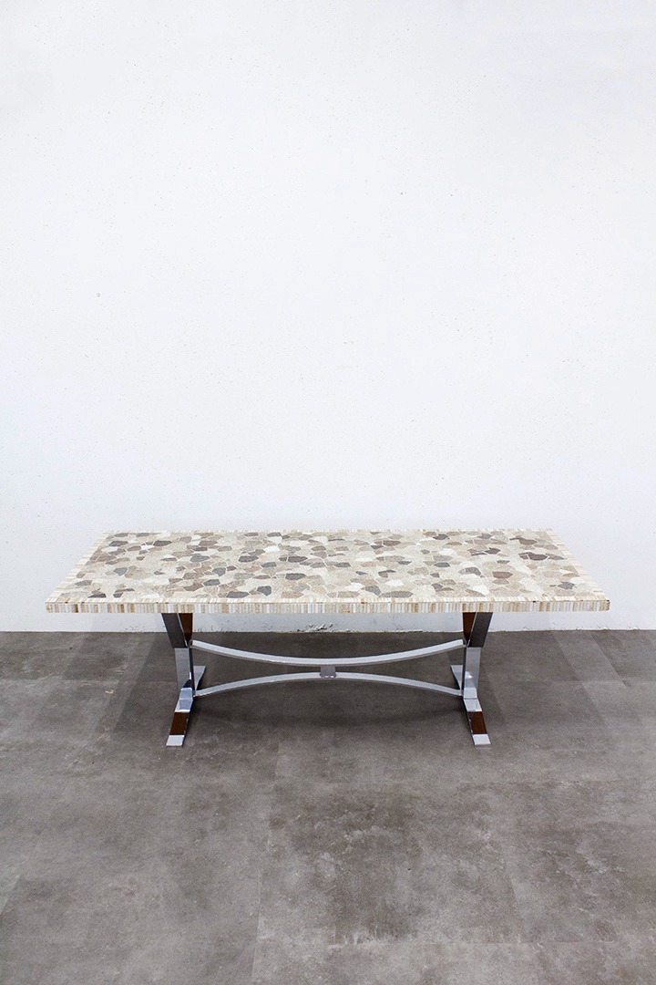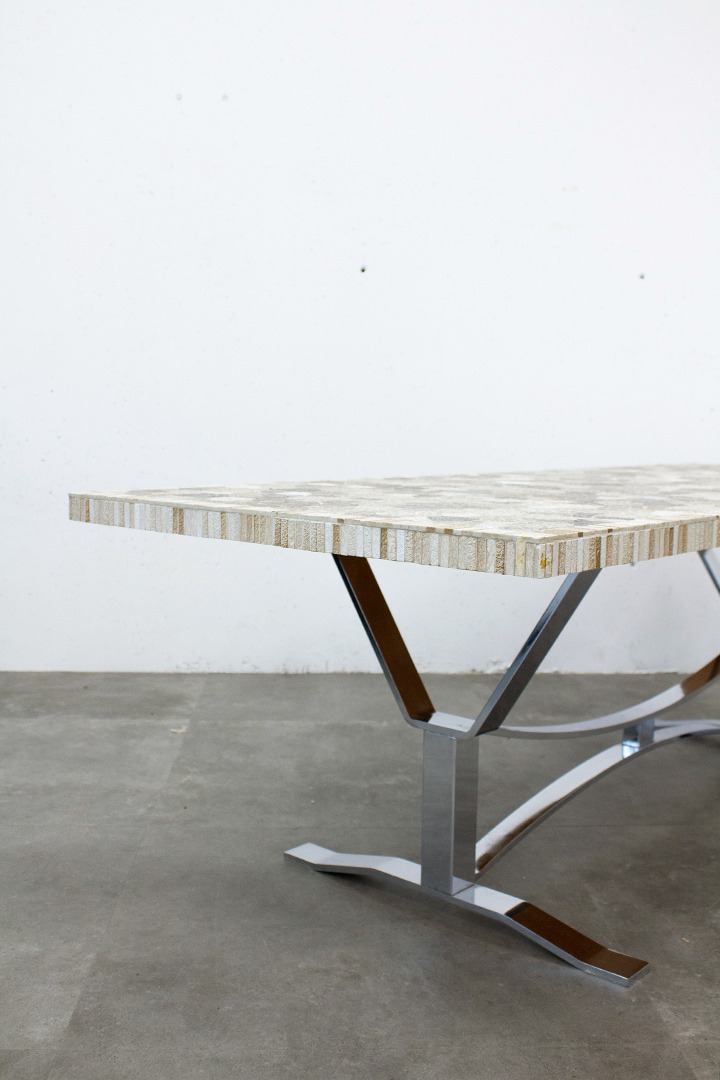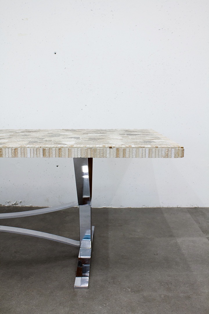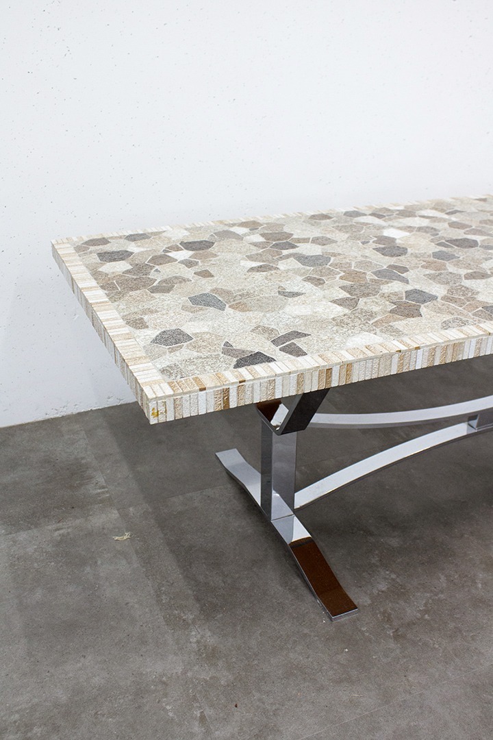 Wat een plaatje is deze salontafel van beeldhouwer en mozaïek-kunstenaar Berthold Müller. Het tafelblad is ingelegd met verschillende granieten puzzelstukjes. De gemêleerde tegeltjes in bruin-, grijs-, wit- en zwarttinten zorgen samen voor een spannend en speels geheel. Volledig in de lijn met andere werken van de kunstenaar! Het blad rust op een verchroomd onderstel waarin ronde en hoekige lijnen een harmonie vormen. Hierdoor krijgt de tafel een heel moderne brutalistische uitstraling.