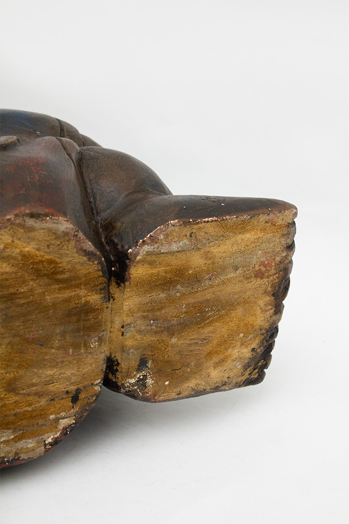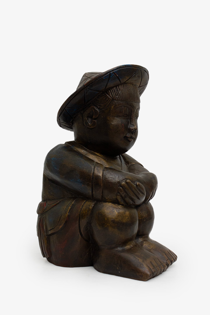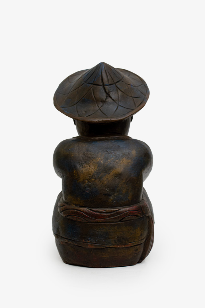 De houding van de jongen en hoed doen sterk denken aan Zuidoost-Aziatische volkskunst, mogelijk Vietnamees of Thais. De vormgeving is eenvoudig maar krachtig. Aan de onderzijde is het hout zichtbaar, inclusief wat verf- en gebruikssporen die passen bij een vintage stuk.