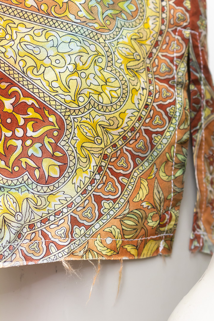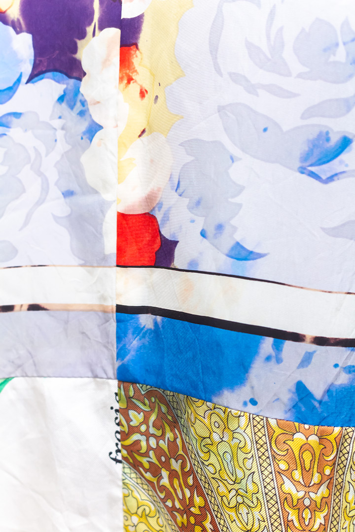 Dit tweedehands t-shirt is bijna twintig jaar oud en verkeert in goede staat. De sjaaltjes hebben een licht gekreukelde look. In het waslabel geeft de ontwerpster aan dat dit zo hoort. Verder vermeldt hij in het label dat de onafgewerkte zomen lichtjes zullen rafelen door gebruik. Helemaal de bedoeling dus!
