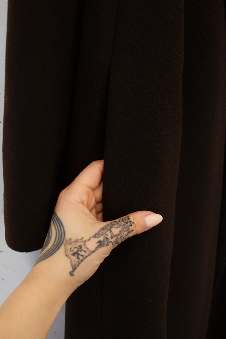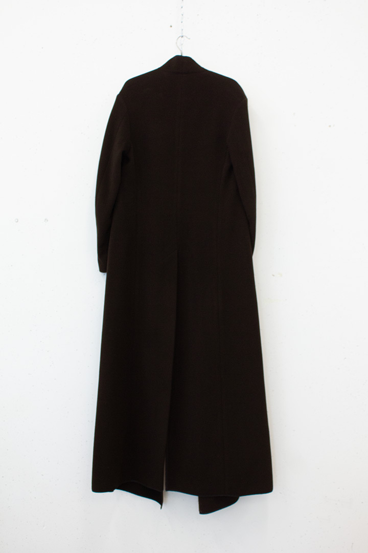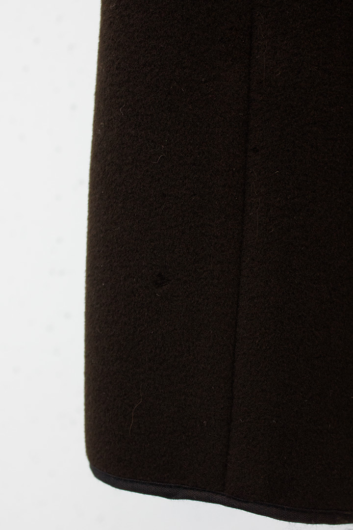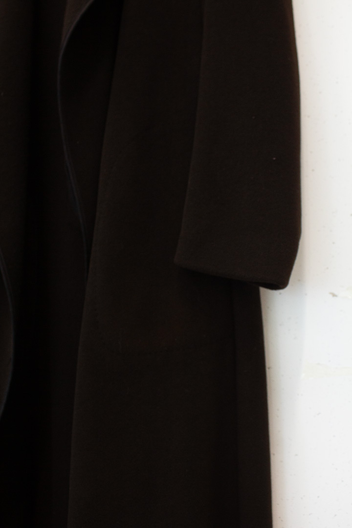 Deze prachtige lange wollen openvallende jas is afkomstig uit het modehuis van toonaangevend Belgisch modeontwerper Dries van Noten. Het is gemaakt van een mix van angora, lamswol en cashmere. De jas heeft geen sluiting, maar is toch dicht te dragen met behulp van het dunne leren riempje. Het model is iets uitlopend wat zorgt voor extra draagcomfort, evenals de hoge achtersplit. De jas heeft aan weerszijden grote zakken in de zijnaad die zijn bevestigd door te punchen en daarna minuscuul door te stikken. De naden zijn vakkundig afgewerkt door een zwarte katoenen biaisband. De mouwen zijn gevoerd met een glanzend bruine polyester voering.