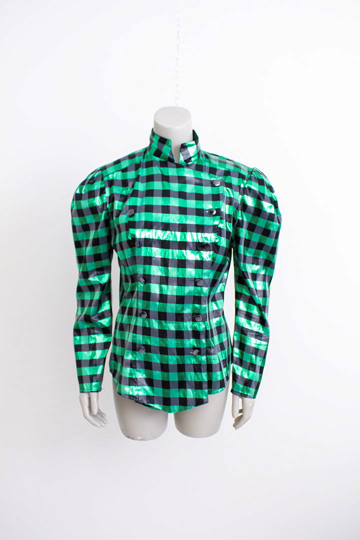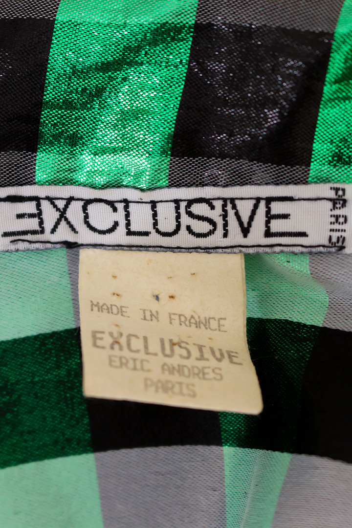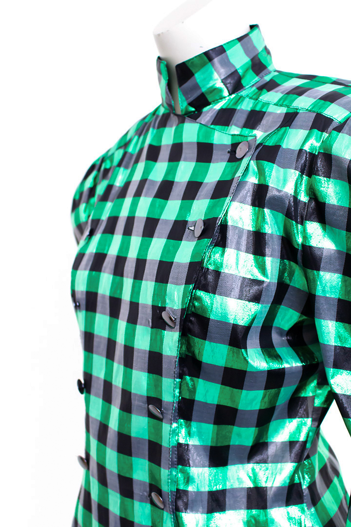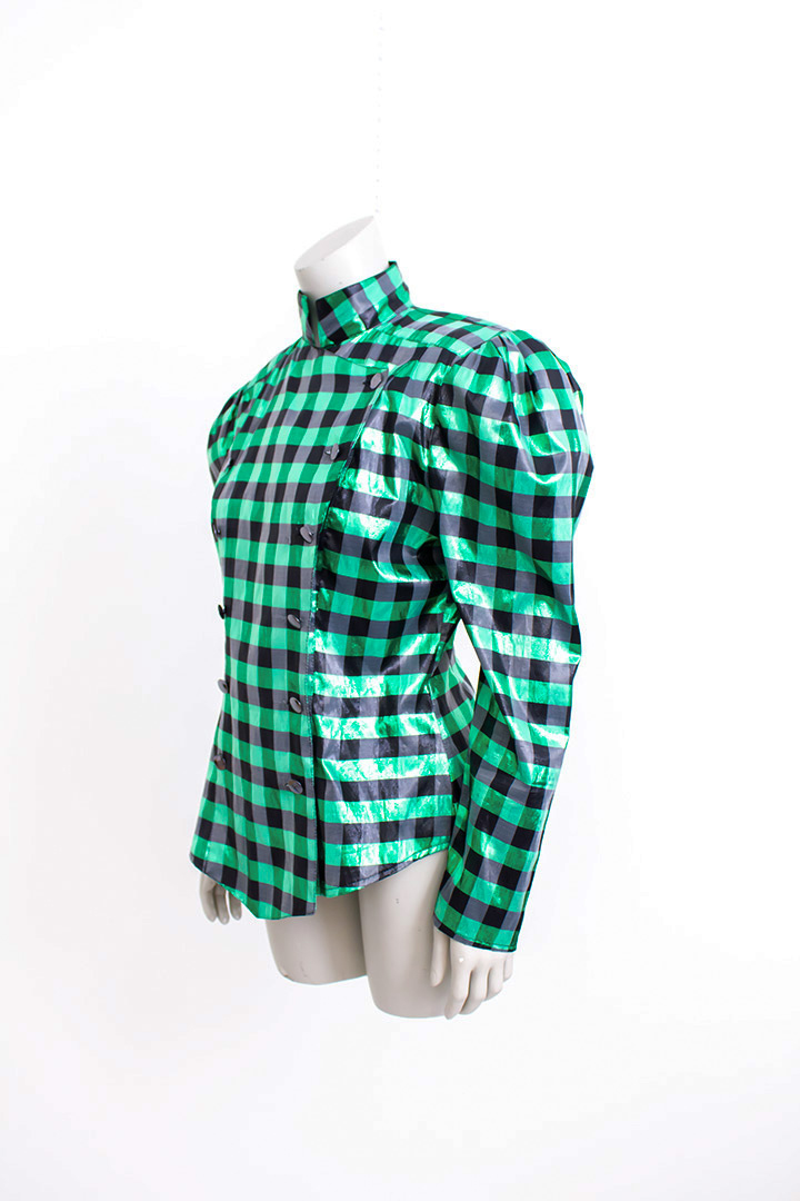 Toffe blouse uit de eighties! Deze glimmende top doet Dior-achtig aan en heeft een geblokt patroon in groen en zwart. De blouse valt mooi gedetailleerd en heeft pofmouwtjes en een opstaand kraagje voor extra allure.