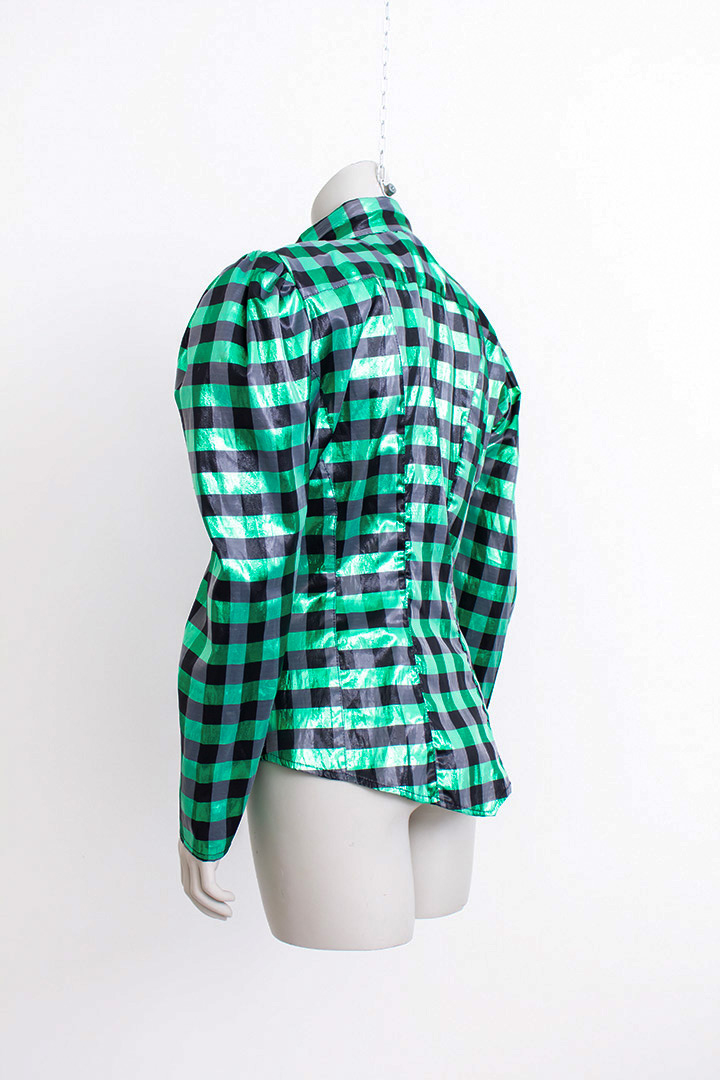 Eighties blouse groen en zwart geblokt met pofmouwen en opstaand kraagje