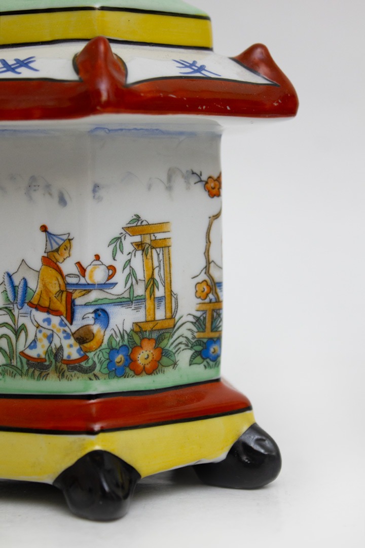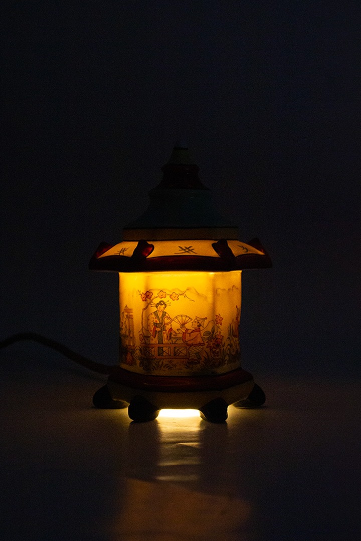 Dit vintage lampje is een in Duitsland vervaardigd interieur item dat de lijn tussen kunst en design doet vervagen. Het handgeschilderde decor is met waanzinnige precisie aangebracht en beeldt een theeceremonie af in een Japanse tuin. Vaak worden de lampjes gebruikt als nachtlampjes, echter staat de pagode-lamp ook waanzinnig in bijvoorbeeld een groot tv-meubel of vitrine.