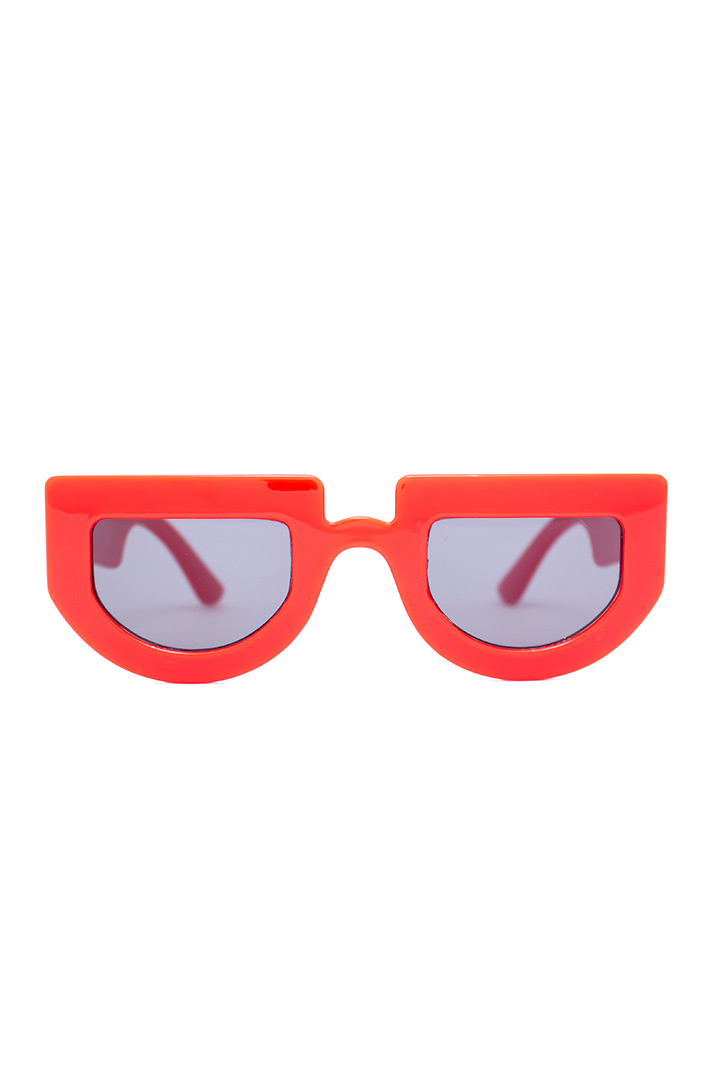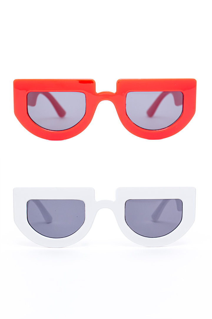 Nineties flat top half circle zonnebril met dikke horn-rimmed frame. 90’s inspired retro zonnebril in de kleur rood en wit en donkere glazen.