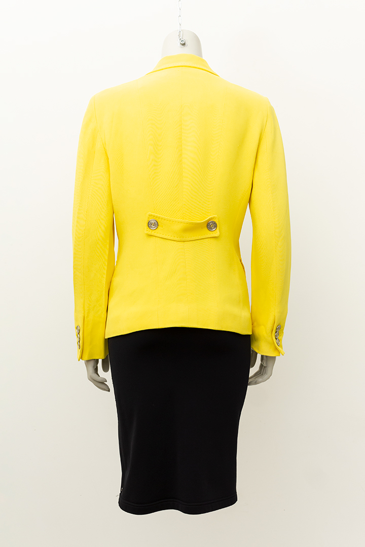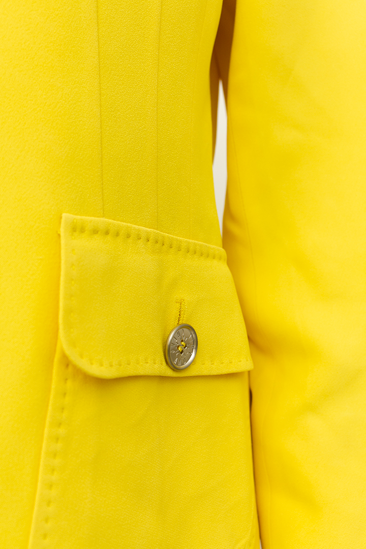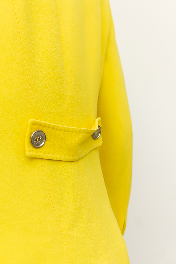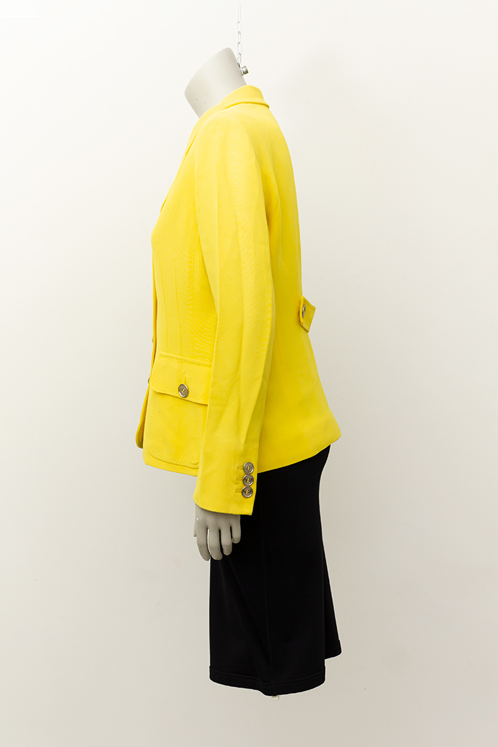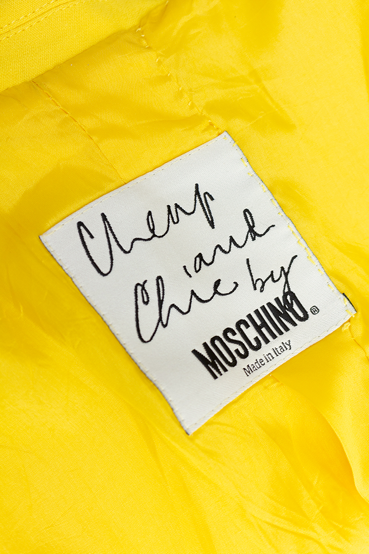 Toffe vintage blazer van het Italiaanse modemerk Moschino. Dit gele jasje komt uit de Cheap & Chic collectie van het merk. De blazer heeft een nauwsluitende pasvorm en valt getailleerd. Het jasje kan open of gesloten gedragen worden. De kunststof knoopjes hebben een metallic look en zijn voorzien van een reliëf met de letters Cheap & Chic. Dezelfde knoopjes zijn ook gebruikt als detail op de rug en aan de mouwuiteinden.