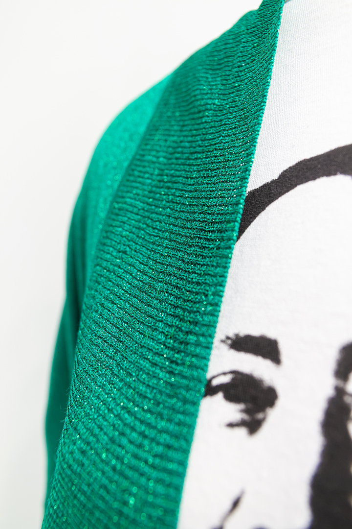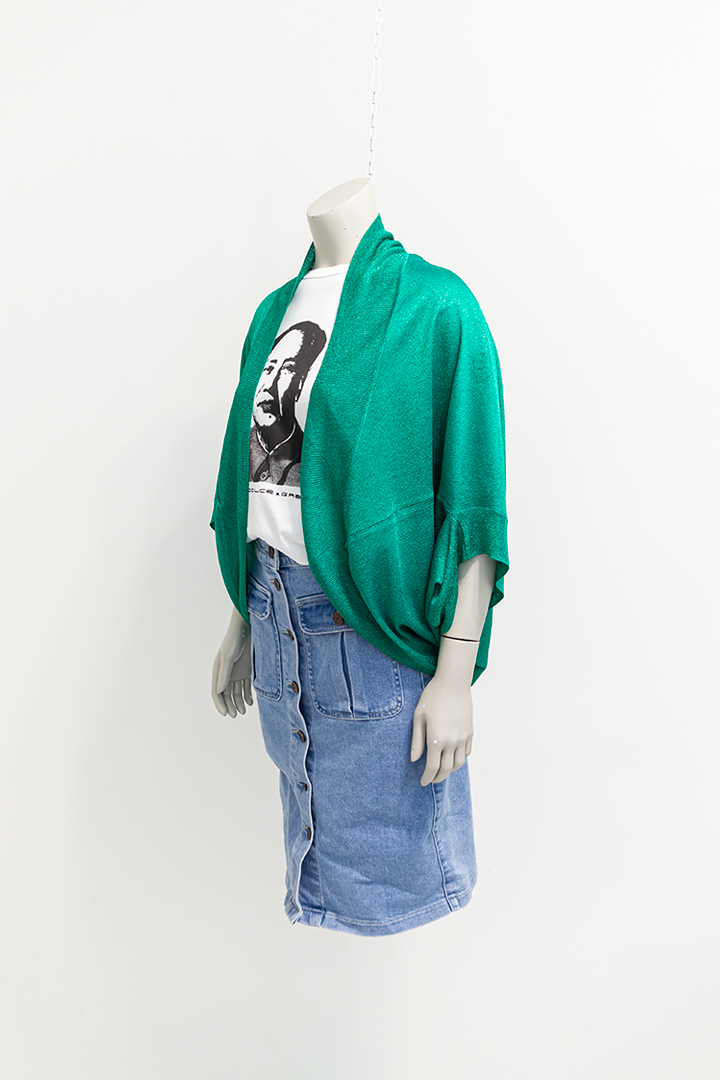 Shine bright met dit wijdvallende groene vest van de Japanse modeontwerper Tsumori Chisato. De stof van deze felgekleurde bolero is gebreid met een draad met glitters. Het model van het vest wordt ook wel een bolero of ‘shrug’ genoemd. Het vestje heeft driekwart mouwen en draagt lekker comfortabel. Je trekt hem gemakkelijk aan over elk soort outfit.