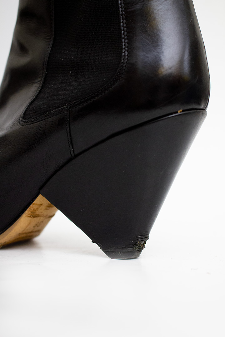 De enkelboots verkeren in gebruikte staat. De zool is licht versleten en helaas zitten er wat krassen in het leer van de hak.