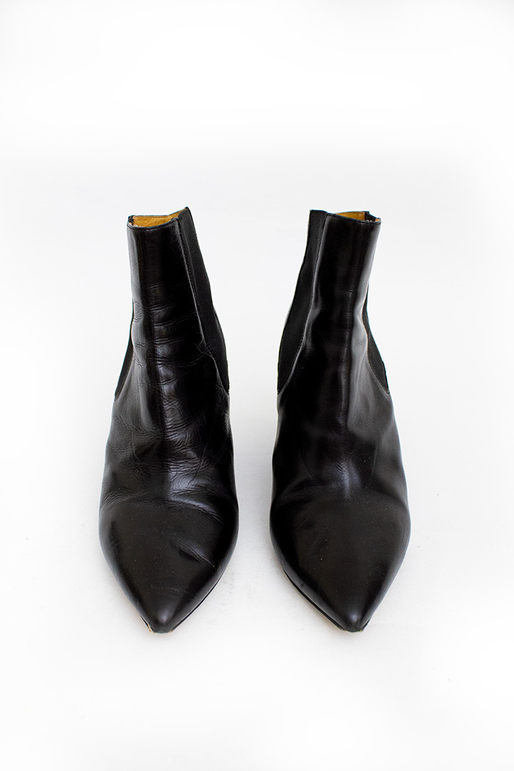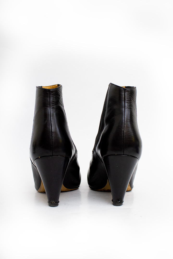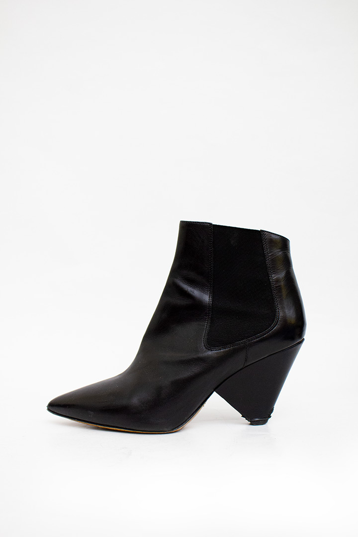 Deze zwarte leren enkelboots zijn afkomstig uit de collectie van de basislijn. De enkelboots hebben geen rits, maar zijn slip-ons. Dit komt door de elastische vlakken aan weerszijden van de schoen, welke zijn geïntegreerd in het ontwerp. Wat meteen de aandacht trekt, zijn de prachtige driehoekige hakken. De enkelboots zijn vervaardigd in Italië. Een klassieke enkelboot met een speelse twist!