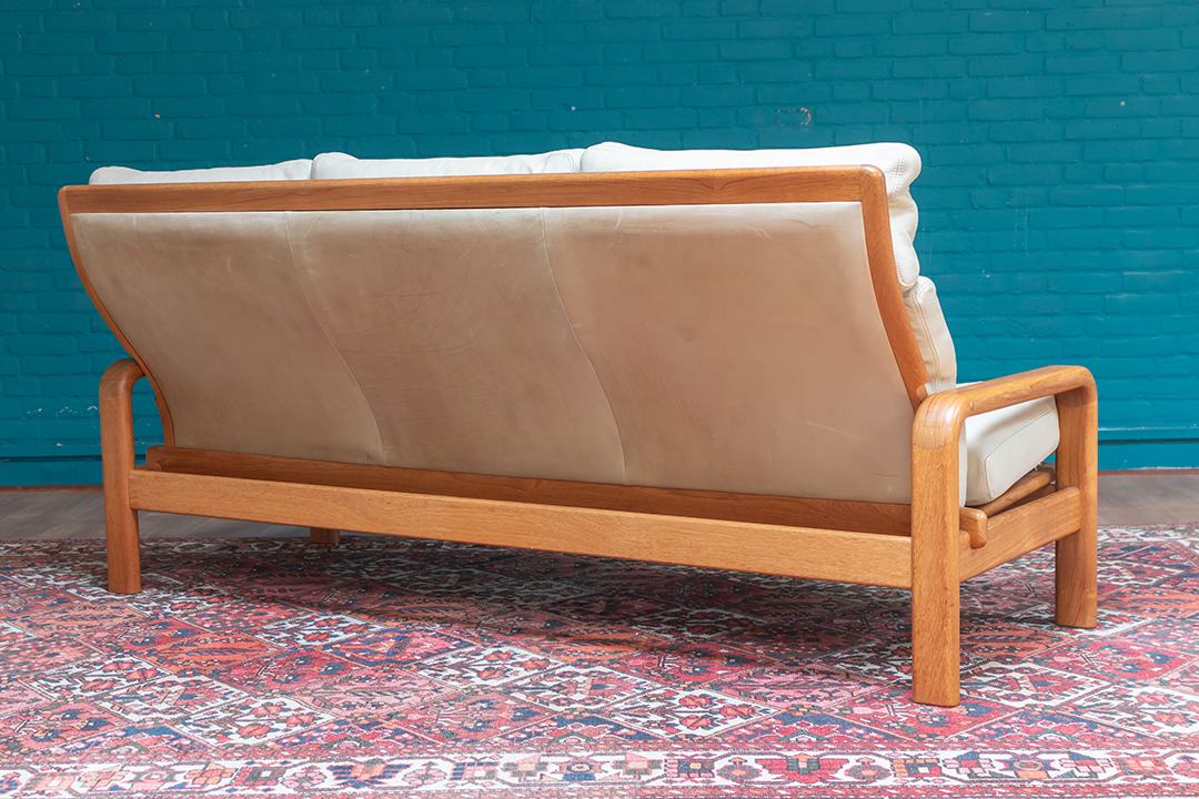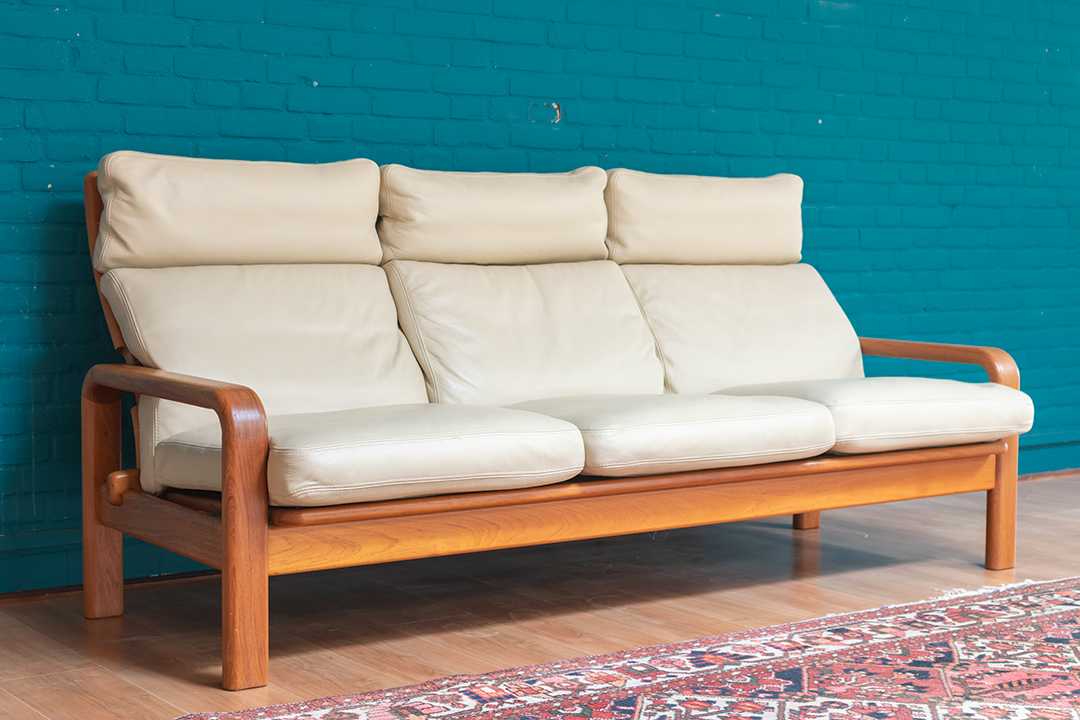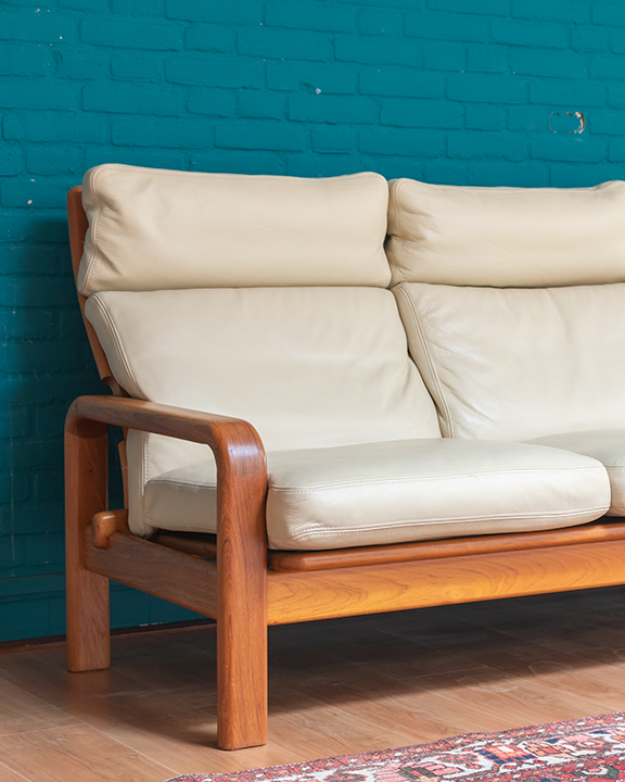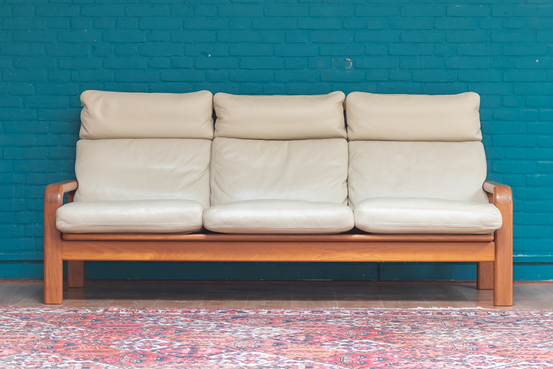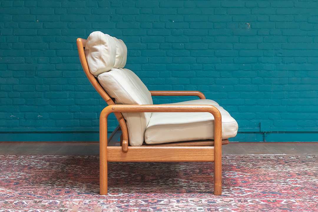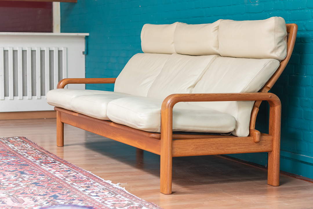 Jaren 60 Deense bank L. Olsen & Son teakhout met crèmekleurige leren bekleding