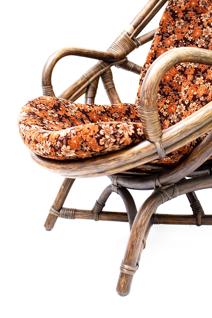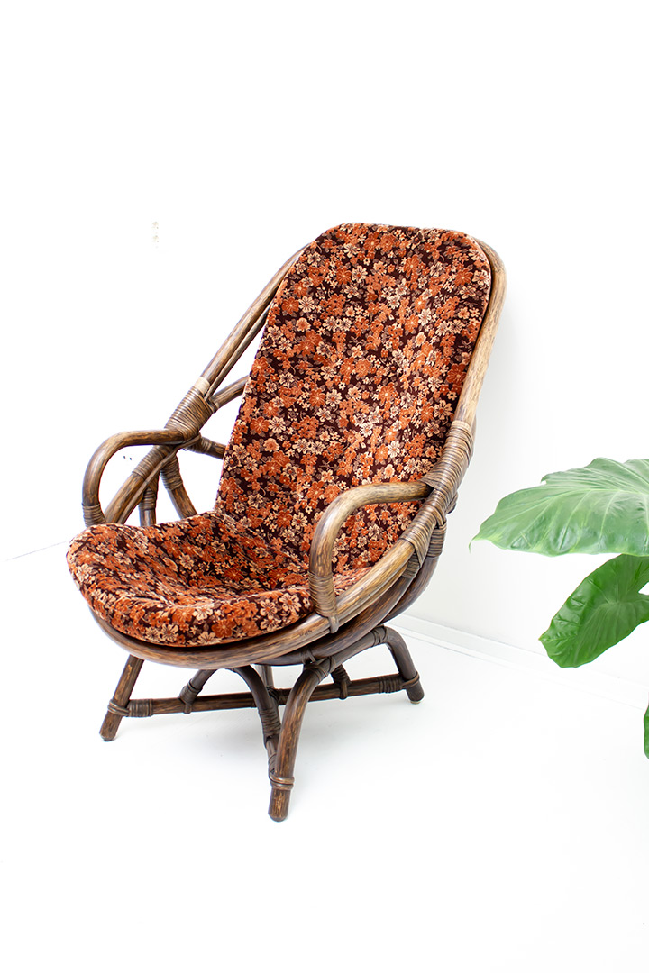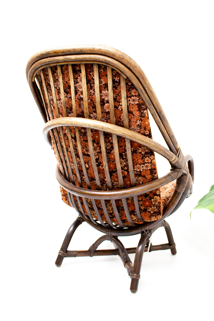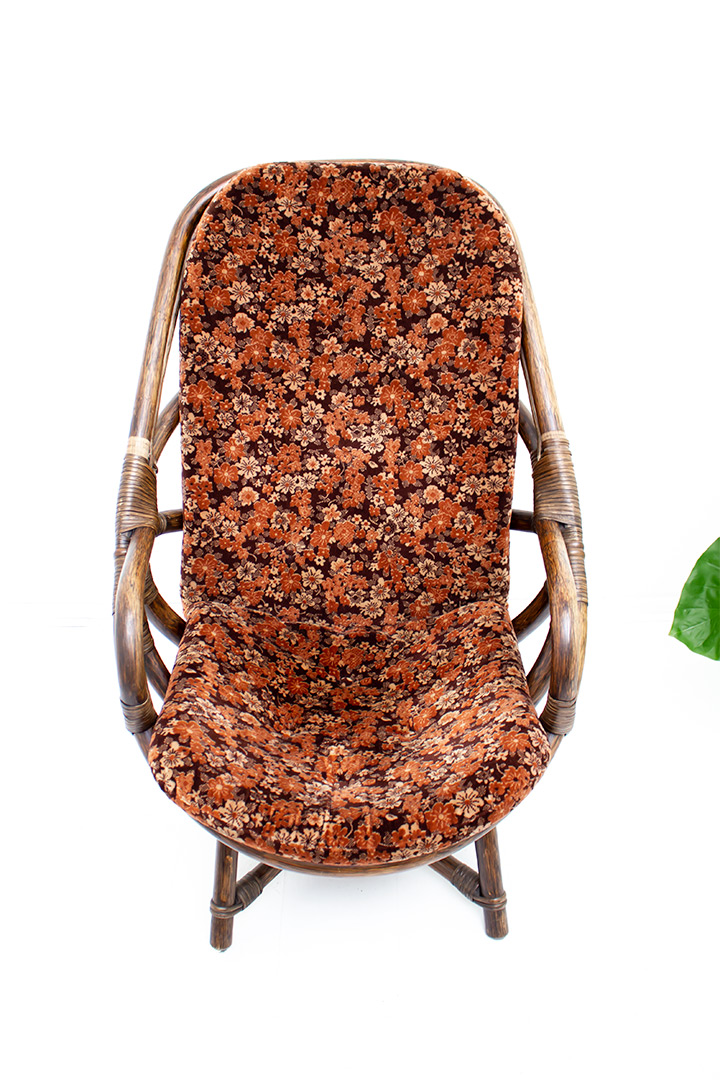 Deze rotan fauteuil uit de jaren 70 zit super comfortabel. De kuipstoel komt inclusief het originele bruin/oranje kussen met karakteristiek seventies bloemenmotief. De fauteuil heeft een lage zit en armleuningen. Heb je een bohemien interieur? Dan staat deze seventies fauteuil te gek!