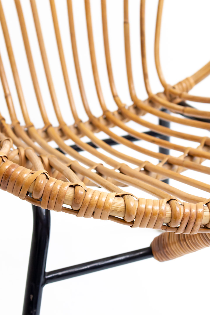 Een vintage klassieker! Dit rotan stoeltje van het Noord-Nederlandse Rohé komen we zo nu en dan tegen. Hij is geproduceerd in de jaren 60-70 en verkeert in goede vintage conditie. De stoel staat op een zwart metalen buizenframe met witte dopjes. Combineer je vintage Rohé met een fijn kleedje of zacht kussen. Voor een bohemien touch aan je interieur!