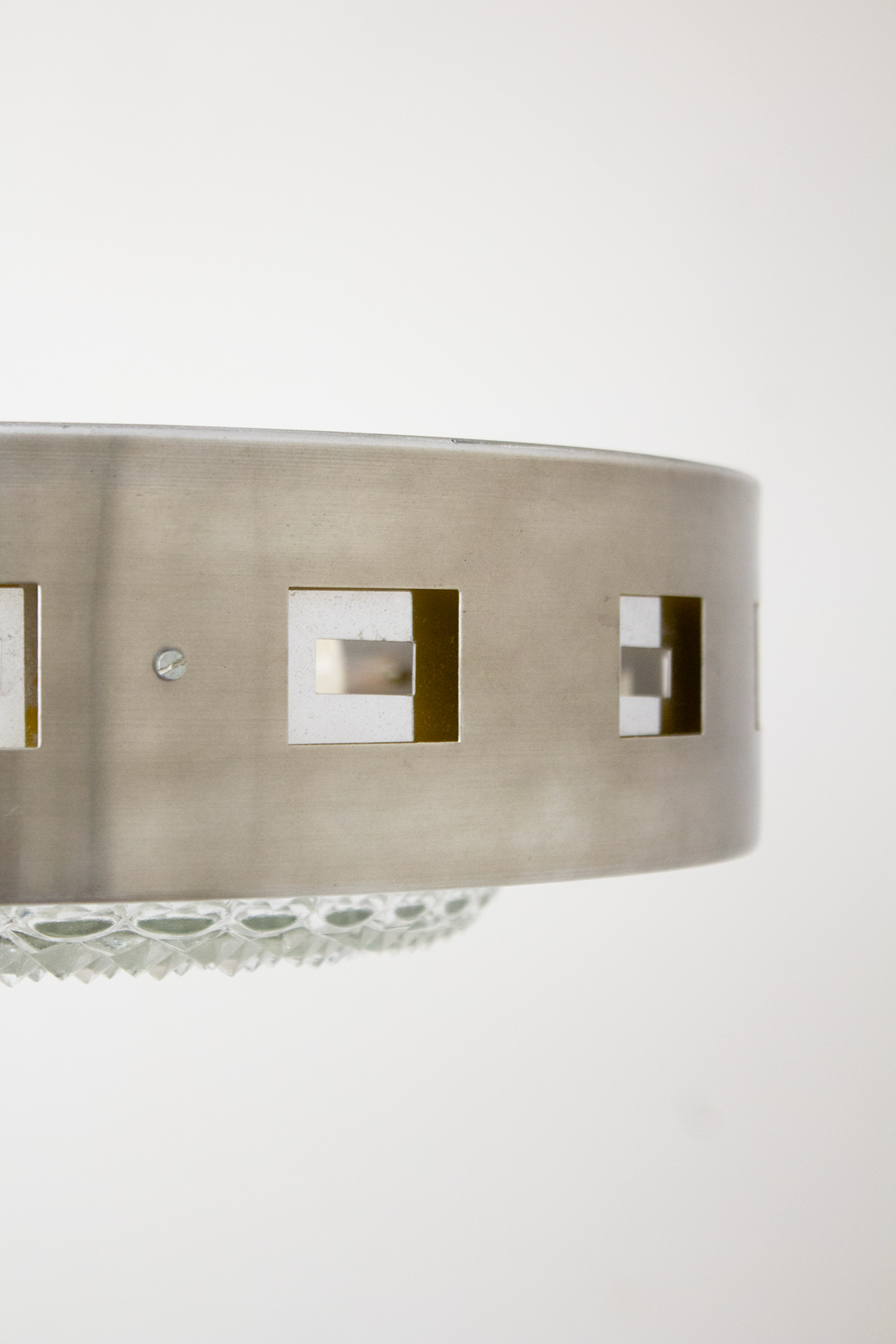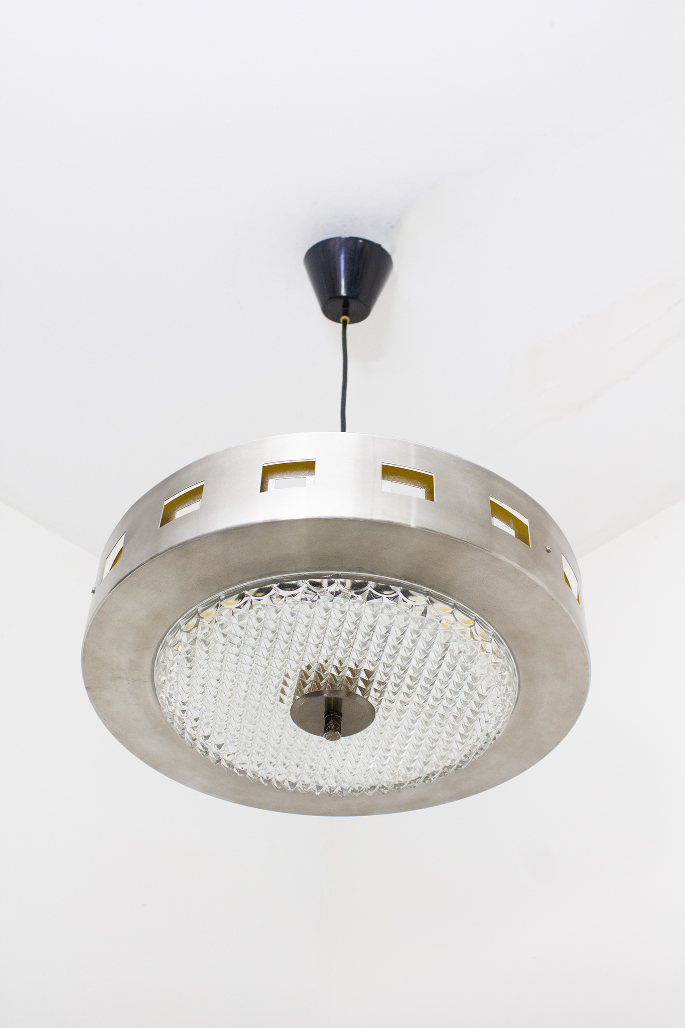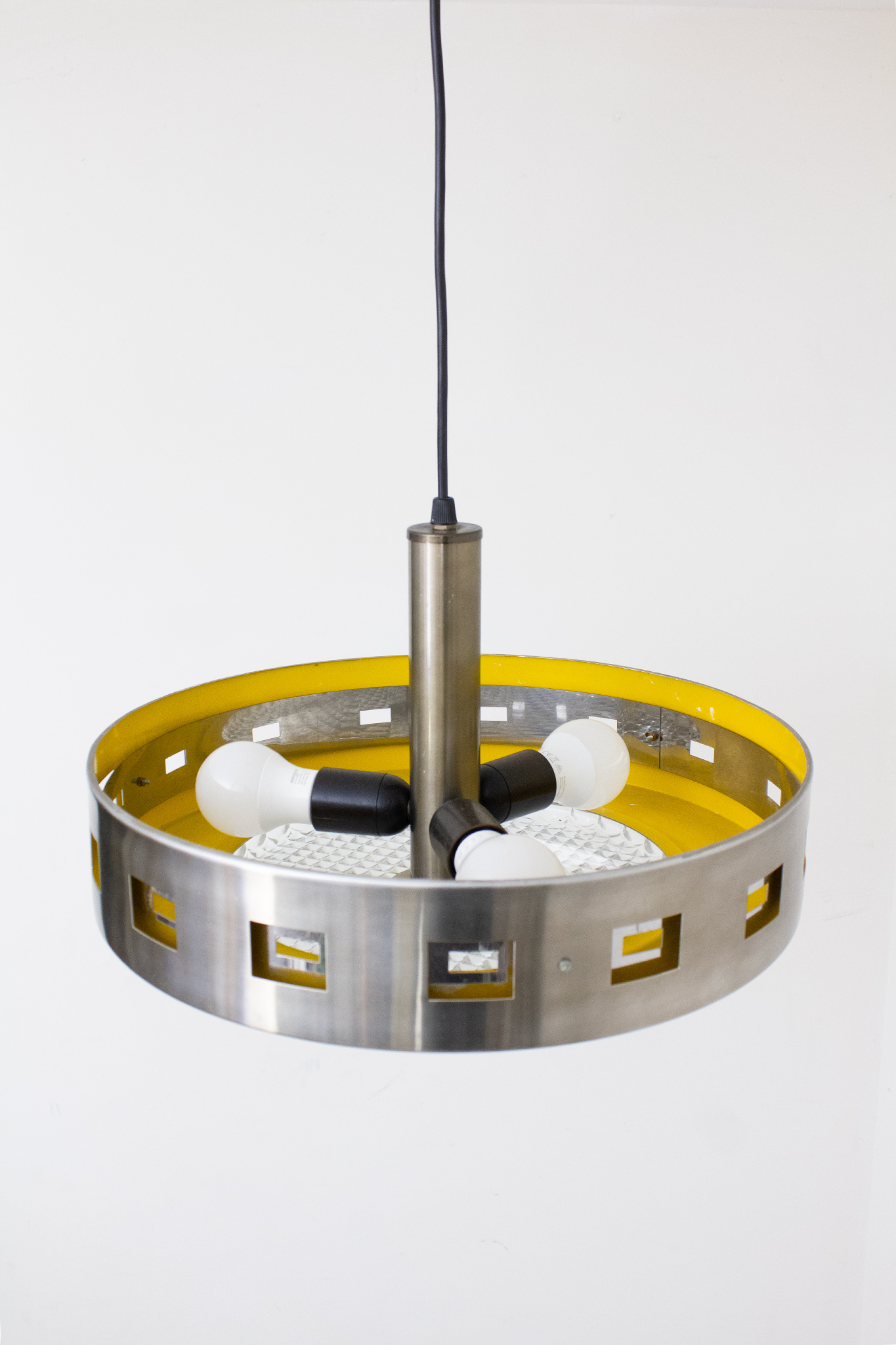 Deze vintage UFO-hanglamp van Massive is een knap staaltje seventies space-age design. Gemaakt van geborsteld rvs met een stoere matte glans, open vierkante uitsparingen rondom en een opvallend geel gelakte binnenkant die het licht een warme gloed geeft.