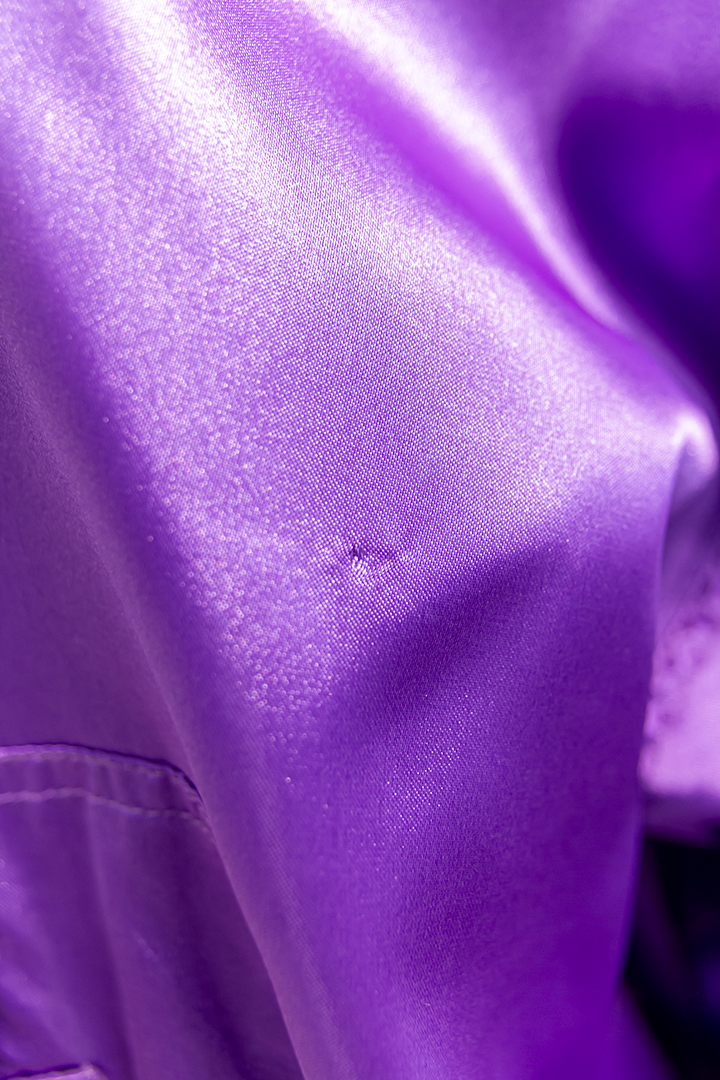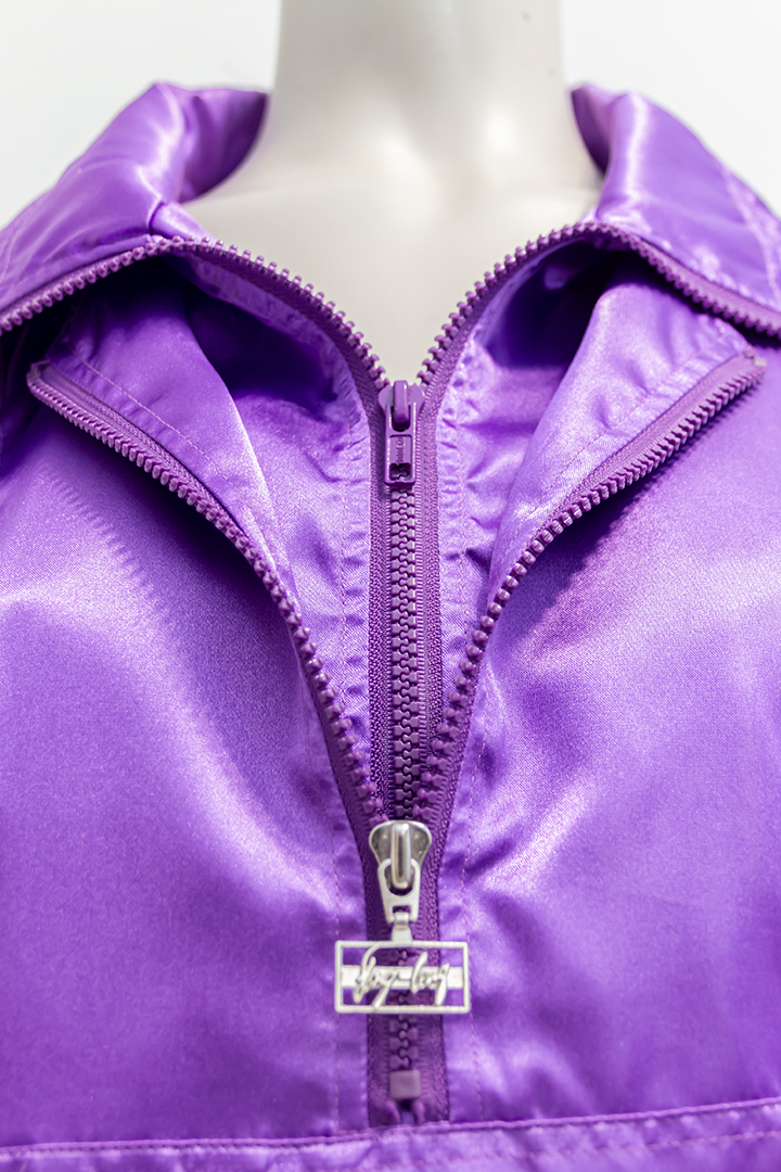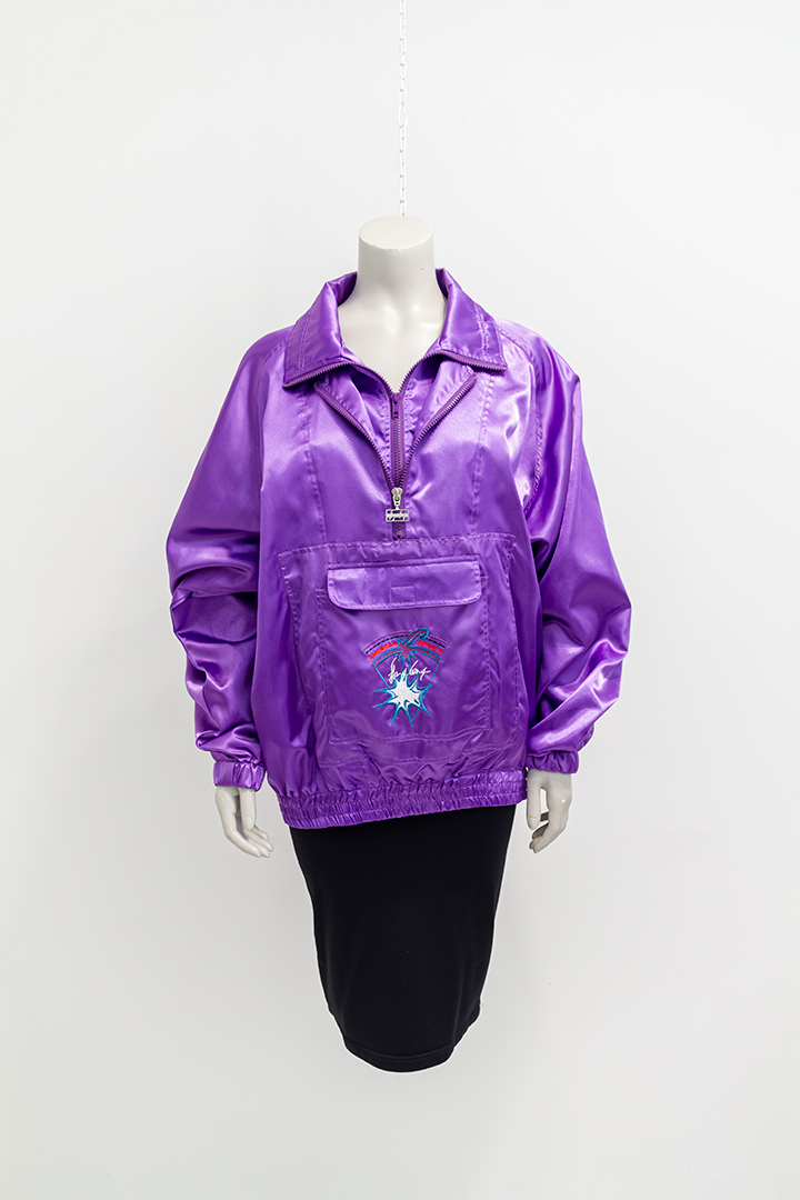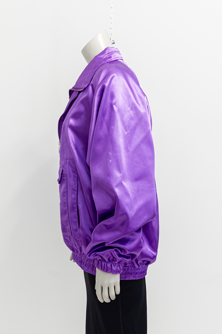 Met deze jaren 80 jas val je op! En dat is precies de bedoeling van de ontwerper Fong Leng: haar designs zijn extravagant en heel kleurrijk. Het jack is vrij dun, gemaakt van paars nylon en glanst je tegemoet. Je trekt de jas aan over je hoofd. Het item heeft een flinke kraag, twee ritssluitingen en een zak op de buik. De jas valt lekker oversized en heeft een elastieken band rond de mouwen en op de heup. Je kunt het jack als jas over een wollen trui dragen, maar hij staat ook perfect als trui. Vintage jaren 80 ten top!
