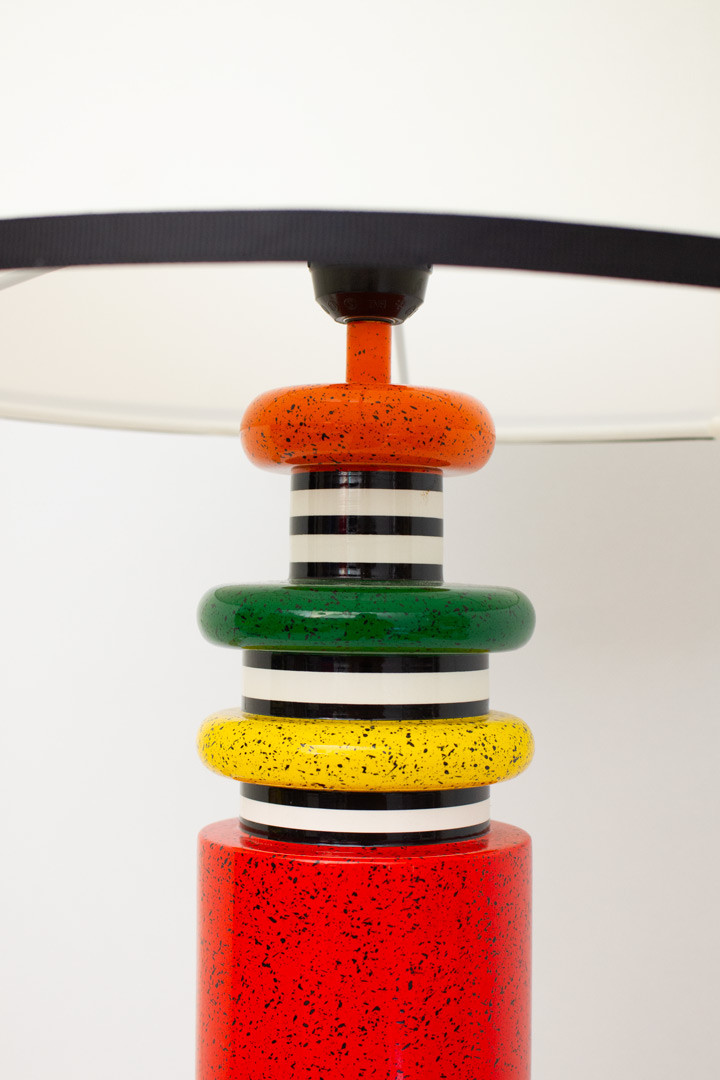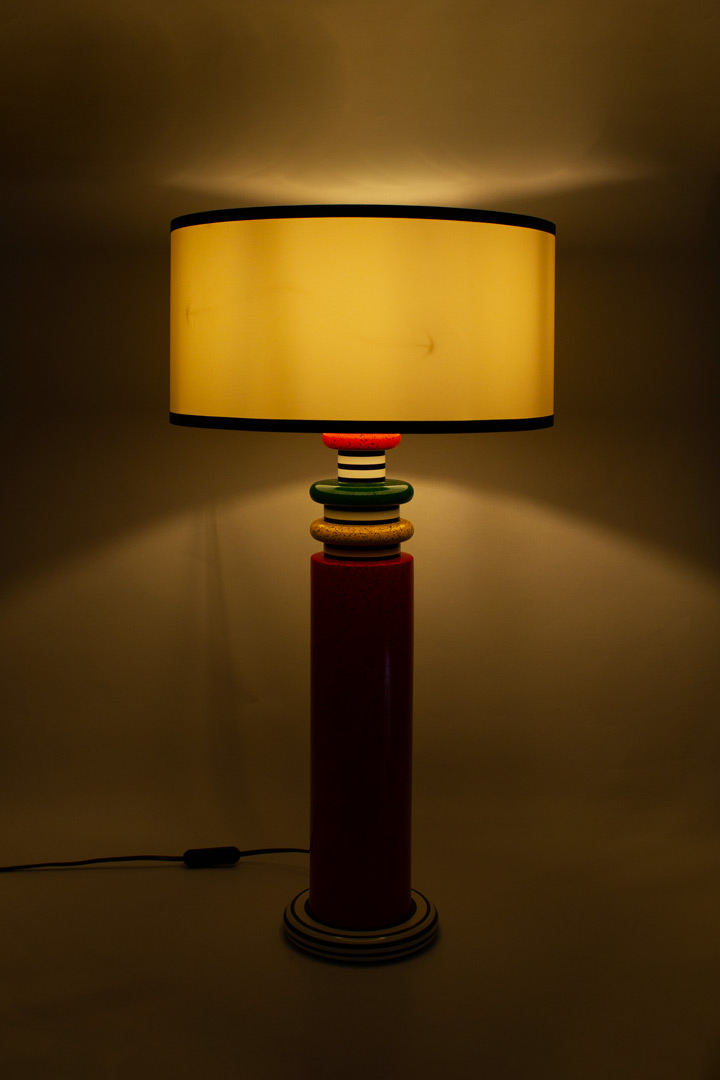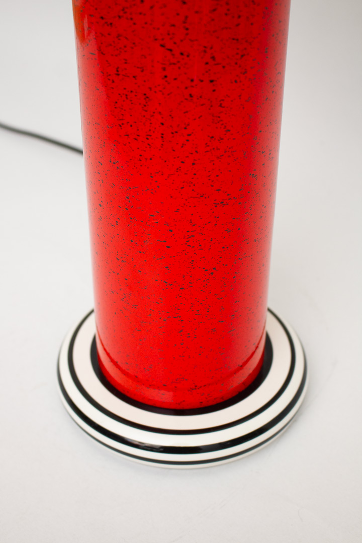 De cilindrische, keramieken voet heeft een opvallende rode kleur met zwarte spikkels, terwijl de basis en de details bovenaan zijn voorzien van kleurrijke, gestreepte ringen in groen, geel en oranje. De grote, witte lampenkap met zwarte randen zorgt voor een prachtig contrast en maakt de lamp tot een echte blikvanger.