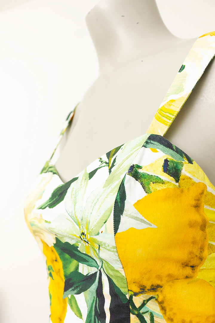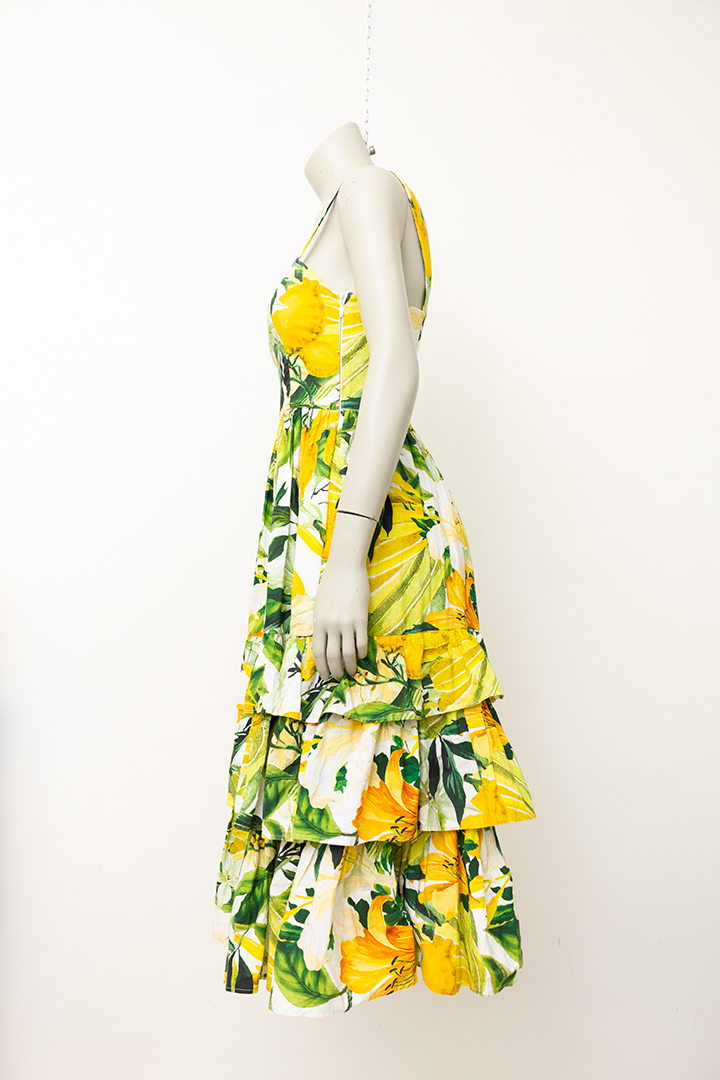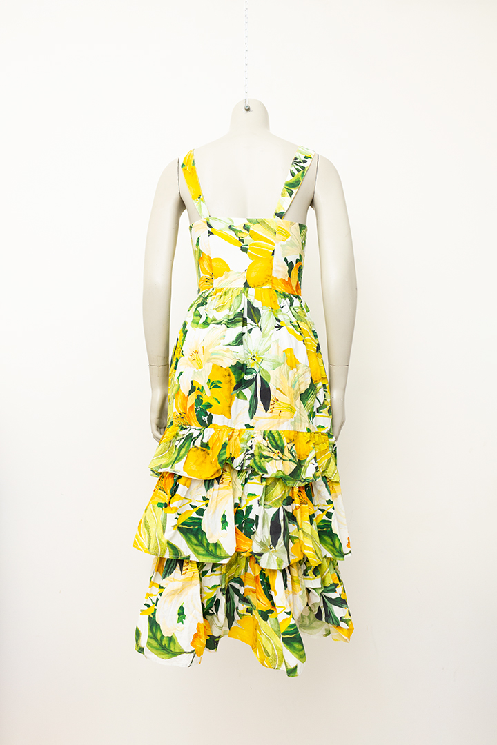 Katoenen zomerjurk geel/groen met tropische bloemen- en fruitprint