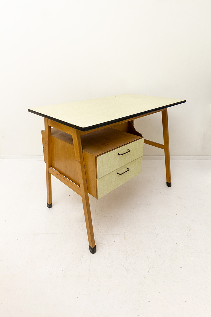 Klein vintage houten bureau met formica tafelblad en lades