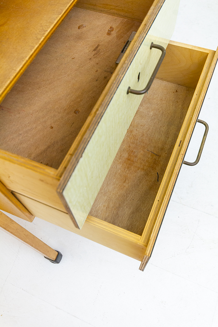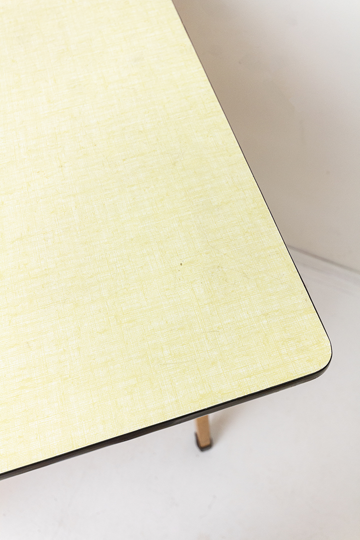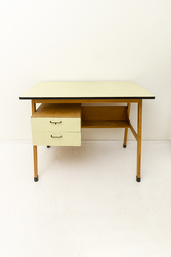 De frontjes van de lades en het tafelblad van dit vintage bureau zijn voorzien van een formica in een gele kleur. Formica is een duurzaam en krasvast materiaal wat veel gebruikt werd in de jaren 50/60. Het heeft een mooie karakteristieke vintage look.