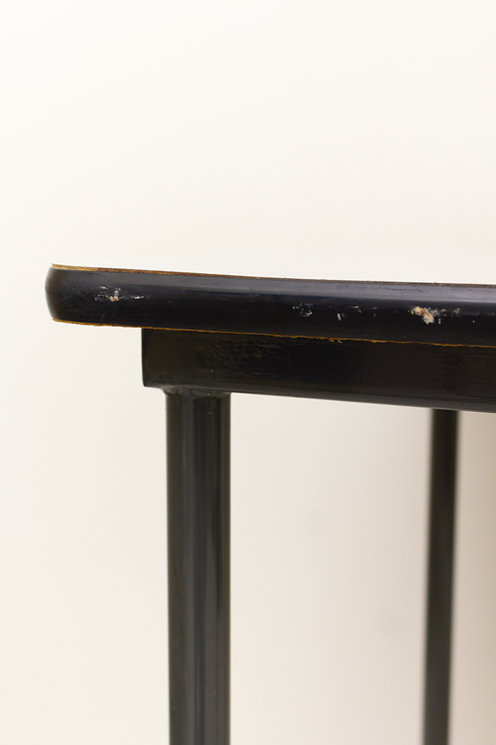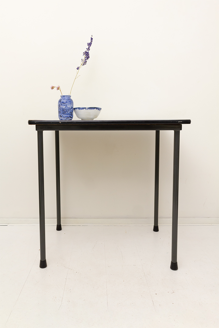 De poten van deze tafel zijn gemaakt van zwart gelakt metaal. De tafel is in goede vintage staat. De rand van het blad heeft hier en daar wat kleine beschadigingen.
