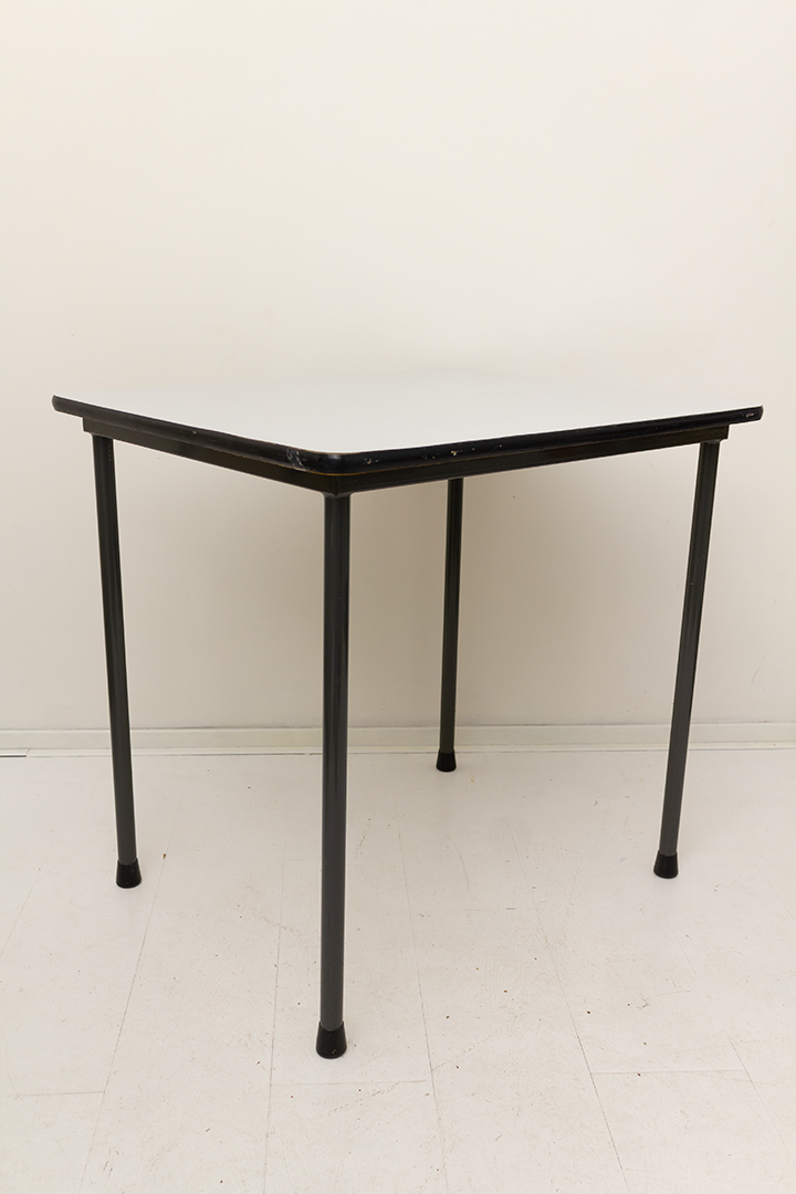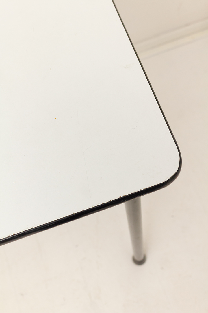 Deze kleine vintage eettafel heeft een eenvoudig en praktisch ontwerp. Dankzij zijn bescheiden formaat plaats je de tafel gemakkelijk in kleinere ruimtes, zoals een studentenkamer. Het tafelblad is gemaakt van formica. Een populair en duurzaam materiaal uit de jaren 60. Formica blijft lang mooi en is goed schoon te maken. Perfect om aan te dineren dus!