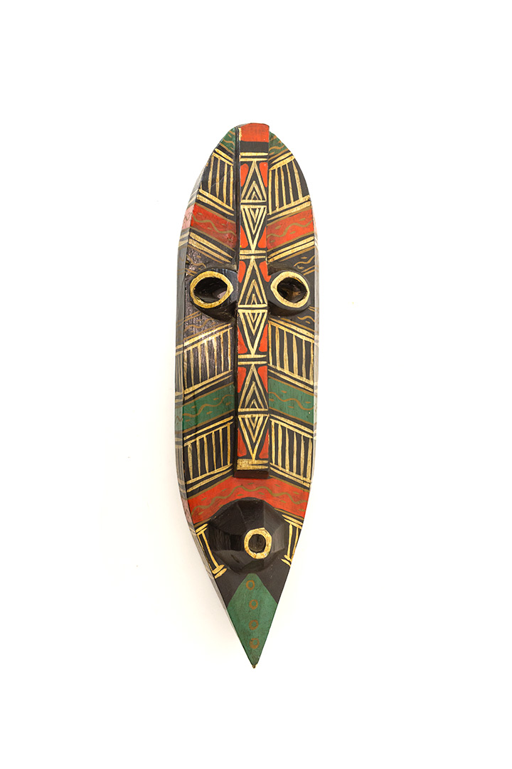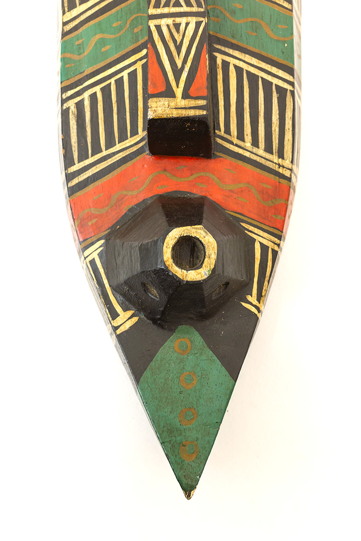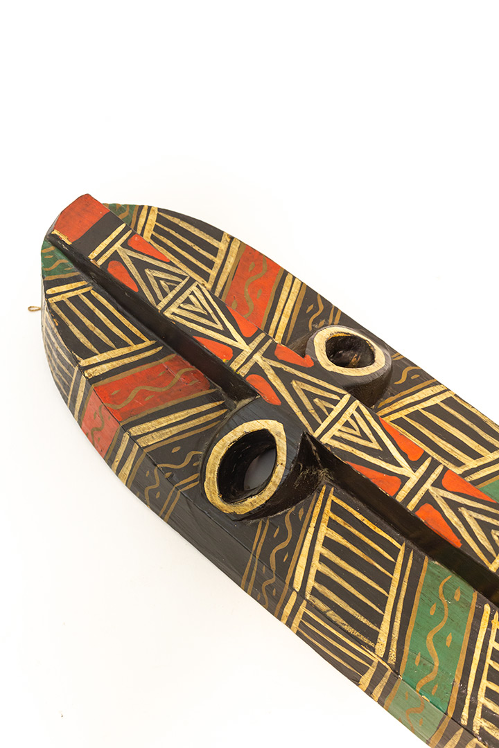 Bijzonder en langwerpig Afrikaans massief houten masker. Het item is zwart gelakt en beschilderd met details in goud, groen en rood. We hebben helaas niet kunnen achterhalen bij welke volk dit masker hoort en wat zijn betekenis is. Maskers zoals deze werden traditioneel vaak in huis gehangen om kwade geesten of slechte energie te verjagen. Nu vooral een erg mooi en decoratief item voor aan de muur of op een dressoir.
