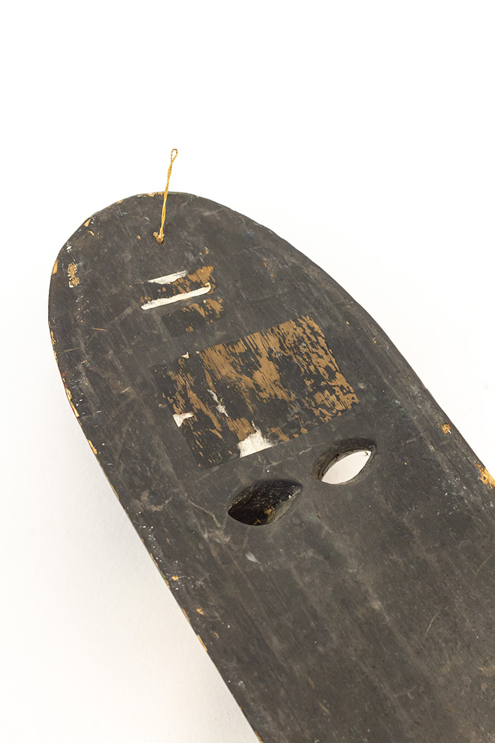 Het houten masker heeft aan de achterkant een lusje waaraan je hem op kunt hangen. Het item is in goede vintage staat.