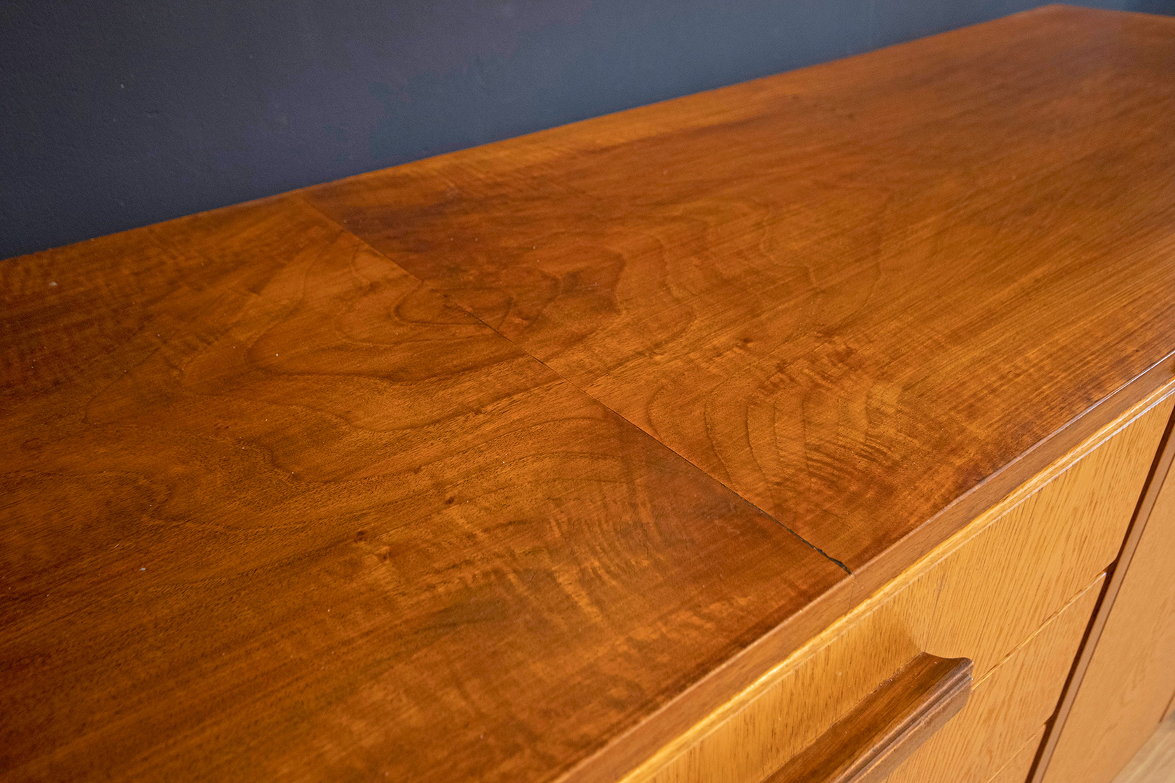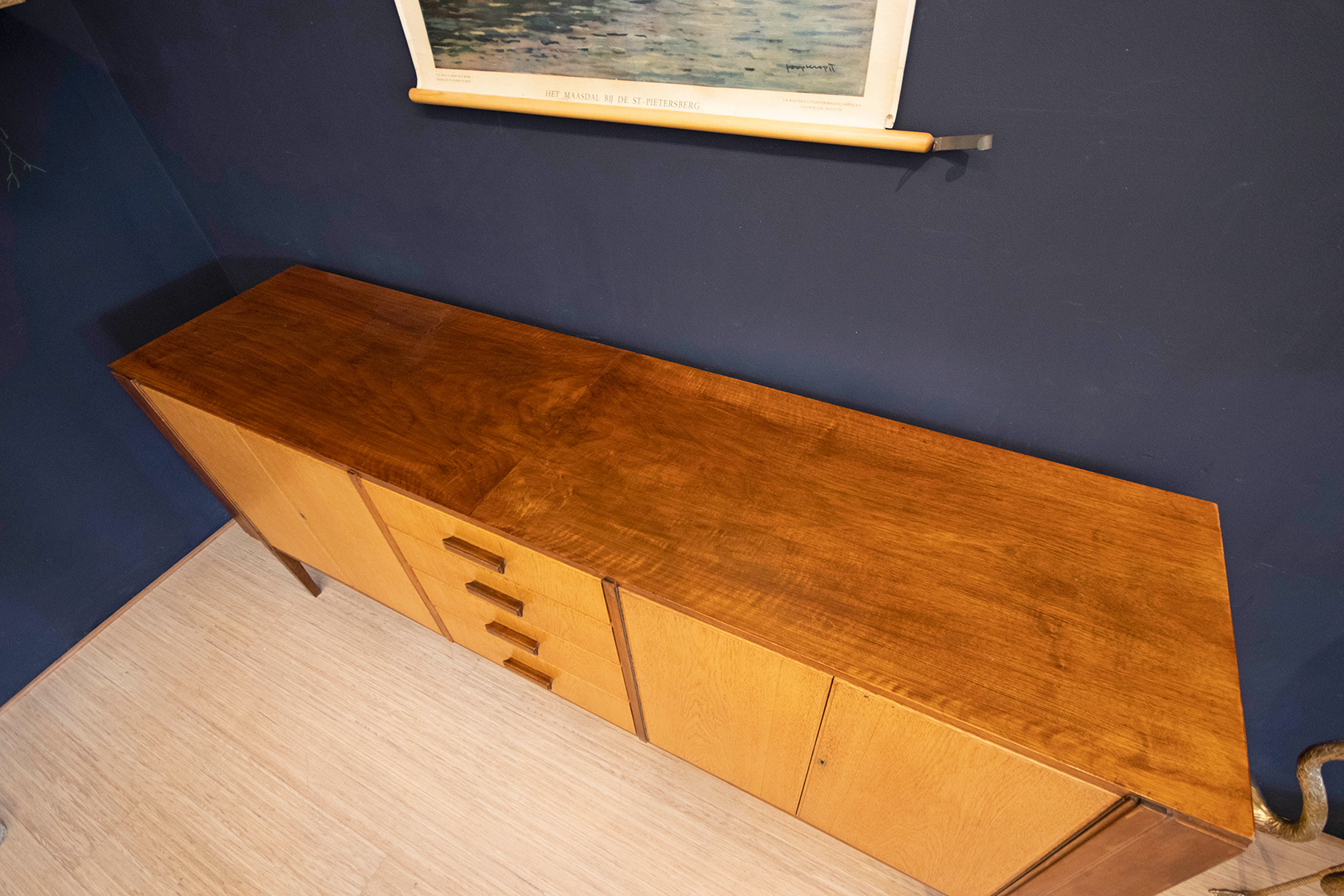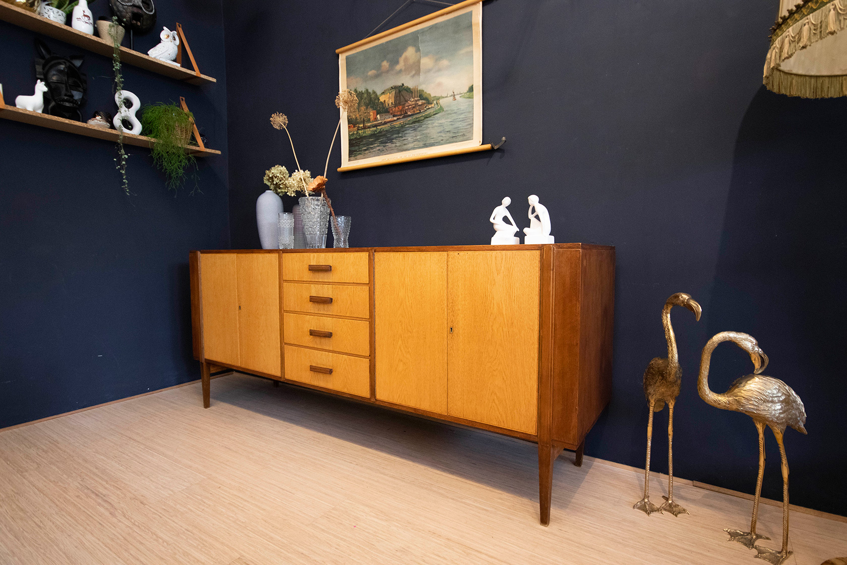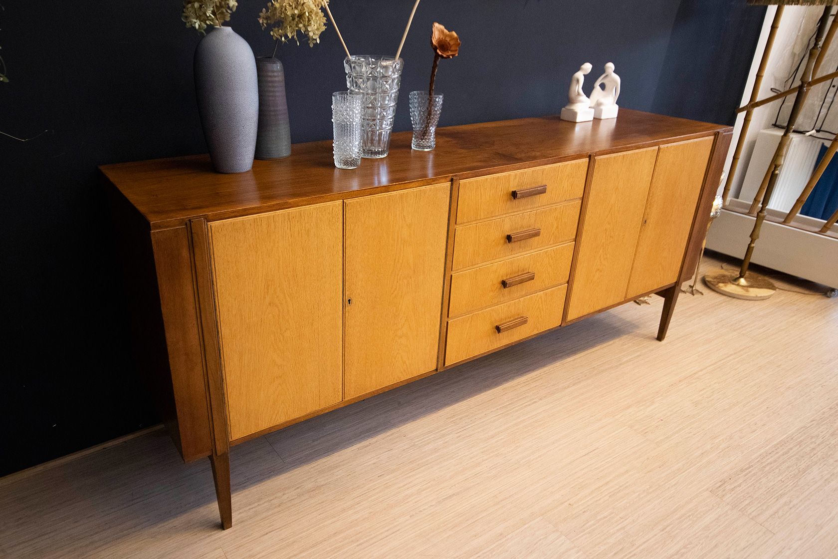 Prachtig vintage dressoir uit de jaren 70 in een tweekleurige mahonie en eiken-samenstelling. Dit vintage dressoir met 4 lades en 4 deurtjes is symmetrisch met de deurtjes aan de buitenzijde en de lades in het midden. Hierbij zijn ook de lades en deurtjes afgewerkt in eikenhout-fineer en het frame en de bovenkant in mahonie-fineer. Het dressoir meet 201 cm lang, 49,5 cm breed en 84 cm hoog.