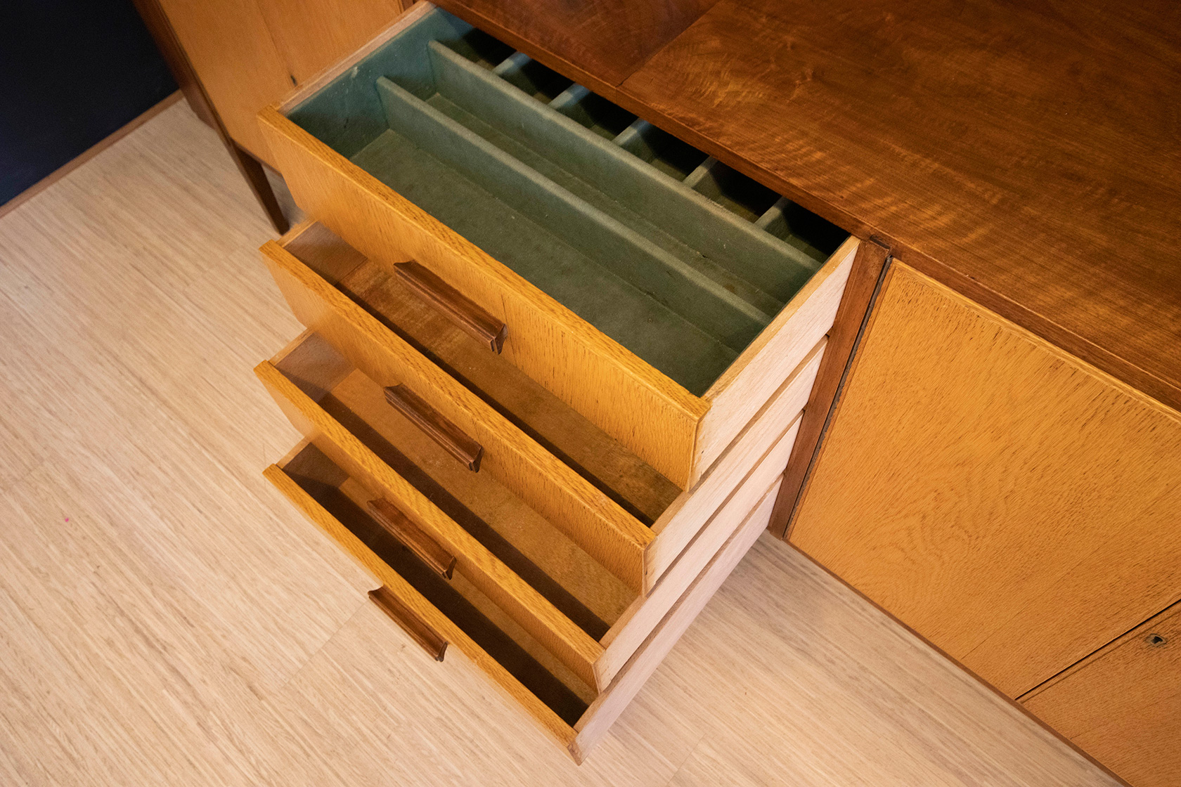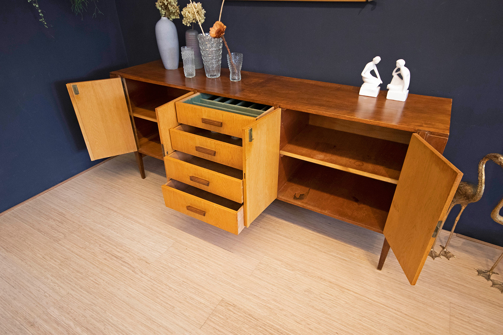 Het dressoir/ sideboard heeft véél ruimte voor het opbergen van allerlei spullen. Links en rechts zijn verdeelde opbergvakken met twee openslaande deurtjes. In het midden vind je 4 lades waarvan 1 lade een indeling heeft voor bestek ingelegd met groen velours. De deurtjes zijn tevens voorzien van een slot en één sleutel is aanwezig.