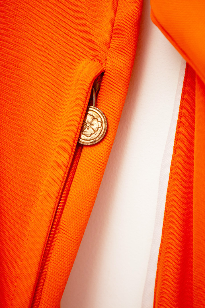 De jas sluit met een ritssluiting, met aan de rits een grote koperkleurige bedel. Dezelfde sluiting is terug te vinden bij de steekzakken die aan weerszijden van het trainingsjasje zijn te vinden.