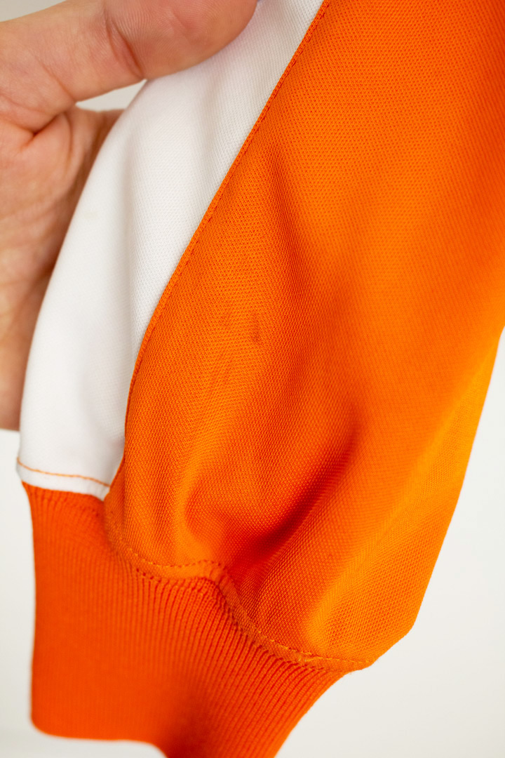 Het trainingsjasje is een echte blikvanger door de feloranje kleur die meteen in het oog springt. Het jasje heeft een relaxte fit en is afgewerkt met oranje boordstof. Een leuk detail is de witte contrast streep die over de mouwen heen loopt. De streep loopt niet alleen met de mouw mee maar stopt, net als bij een raglanmouw, in de hals.