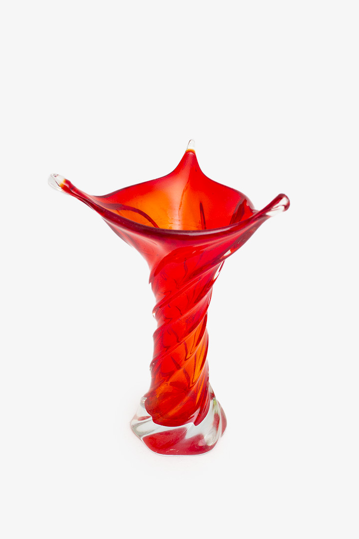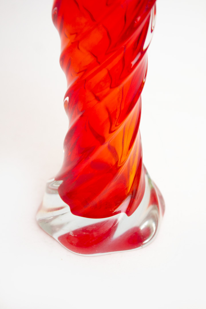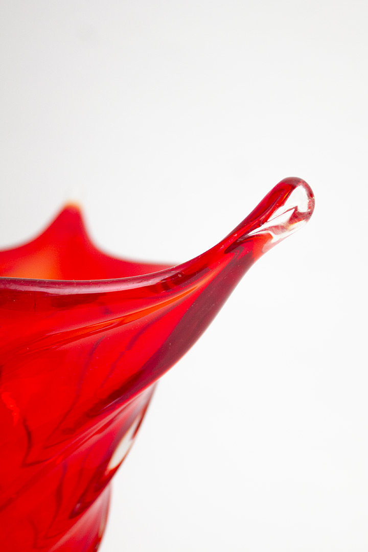 Rode gedraaide 60/70s Murano glazen vaas puntige rand