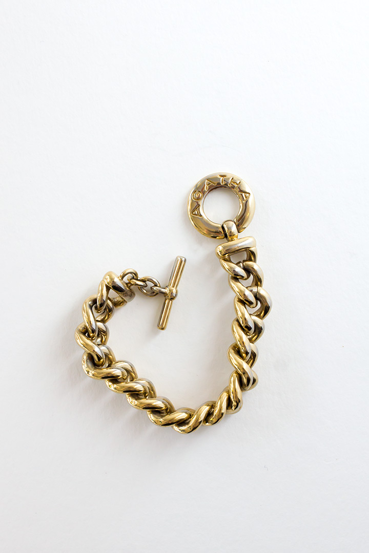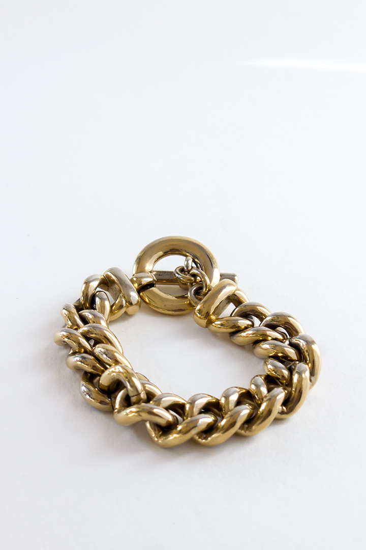 Goudkleurige schakelarmband met kapittelsluiting. Maak een statement met dit opvallende sieraad. De armband heeft een flink gewicht en afmetingen. De gouden schakels geven je minimalistische outfit een tijdloze look. Draag je liever uitgesproken kleuren en prints? Ook dan staat de schakelarmband je prachtig.