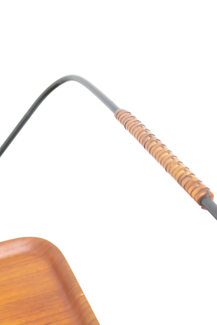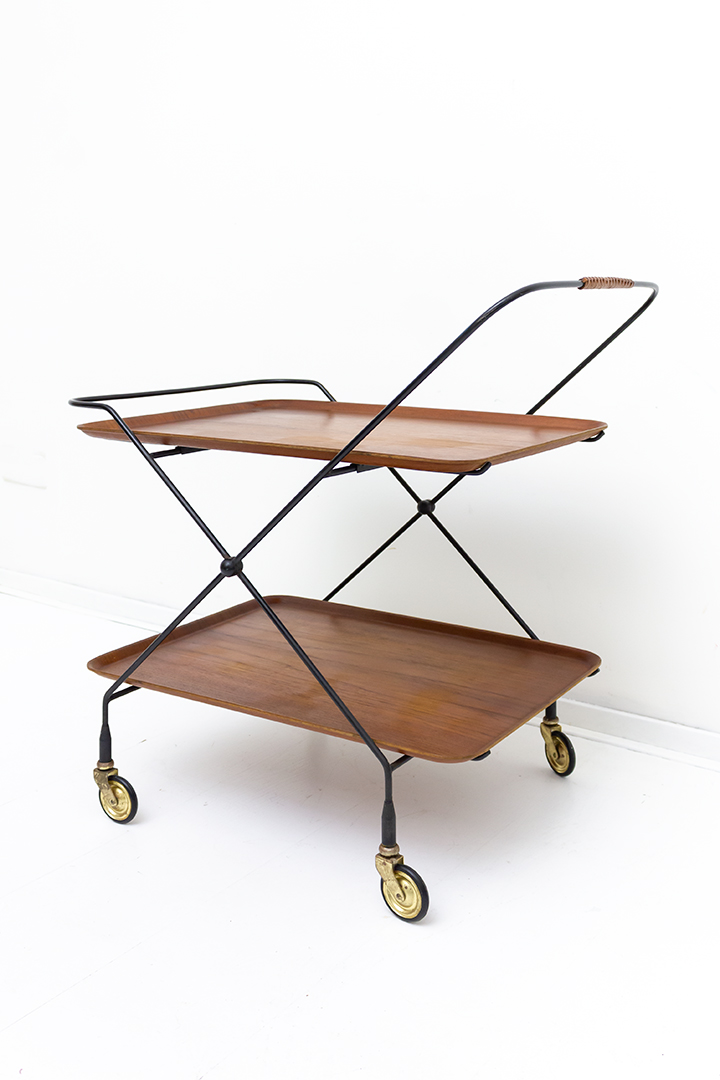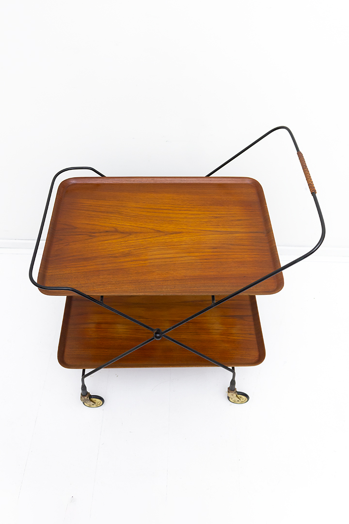 Leuke vintage serveerwagen met twee dienbladen van houtfineer. De bladen rusten in een elegant zwart draadstalen frame met gevlochten leren handvat. De serveerwagen staat op vier wieltjes van metaal met een rubberen laagje. De wagen rijdt soepel en is dankzij de losse bladen heel handig als barcart of voor het serveren van diners. Ook leuk als bijzettafel of meubeltje voor je verzameling planten.