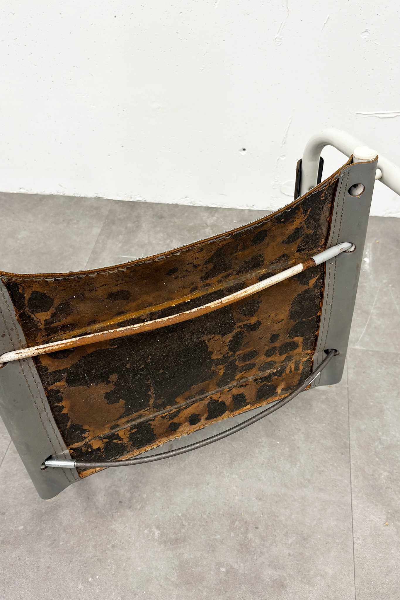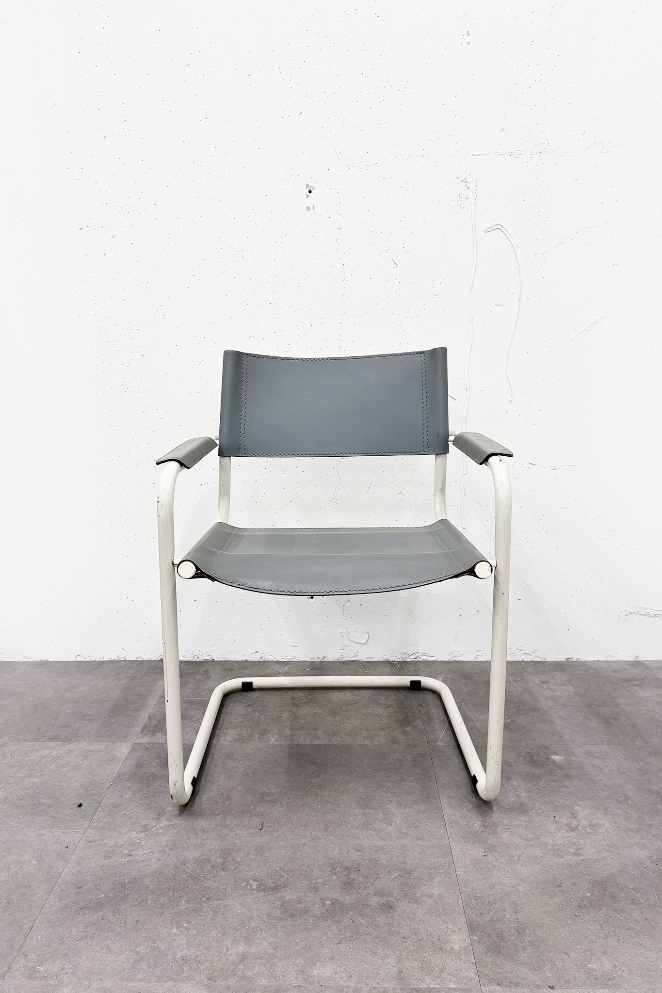Alle stoelen hebben door de leeftijd en het intensieve gebruik wat vlekjes op het leer en patina/ vlekken op het buisframe. In onze winkel hebben we nog 3 van zulke stoelen ter beschikking maar dan met een grijze frame.