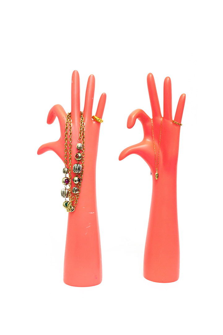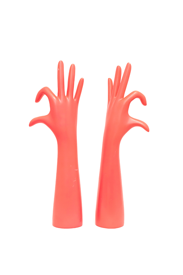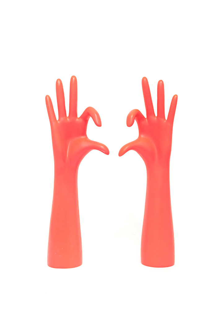 Deze funky handen kun je gebruiken als sieradenhouders. Ze zijn waarschijnlijk gemaakt van hout en gelakt in een felle neoroze kleur. We vermoeden dat de handen ooit bij een paspop hoorde, er zit schroefdraad aan de onderzijde. Nu erg leuk als beeld of voor het bewaren van ringen, armbanden en kettingen. Heb je een eigen winkel? Deze handen doen het vast tof in de etalage!
