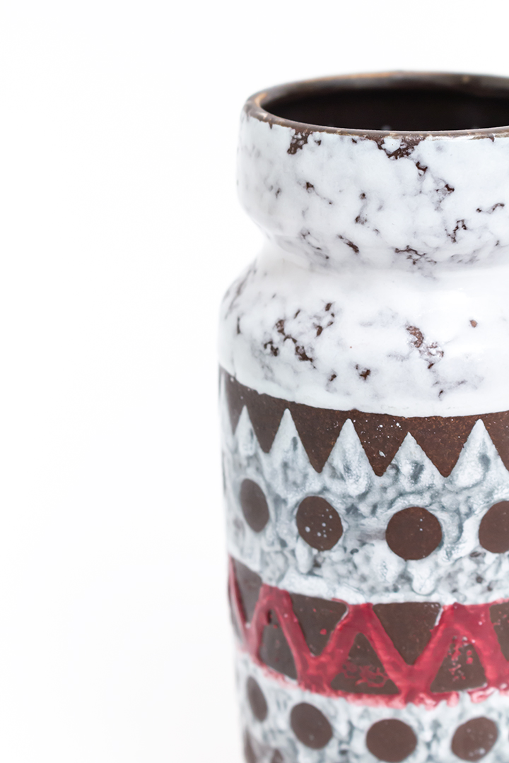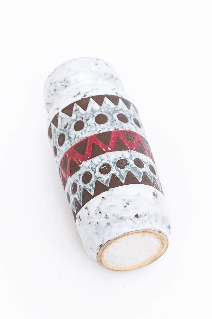 Dit leuke vintage vaasje is van het merk Strehla. De vaas heeft een wit fat lava glazuur en is voorzien van een decoratief zigzag patroon in rode en bruine tinten. Vaasjes zoals deze dateren zo rond de jaren 60 of 70. Een leuk vintage item voor een retro touch in huis!