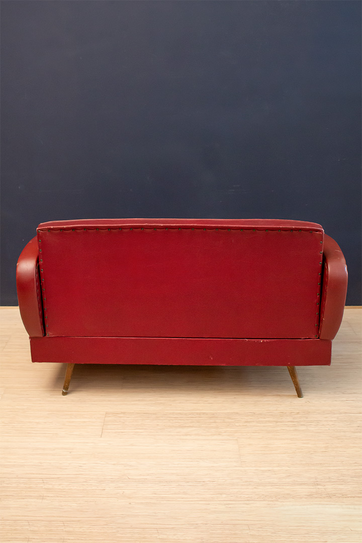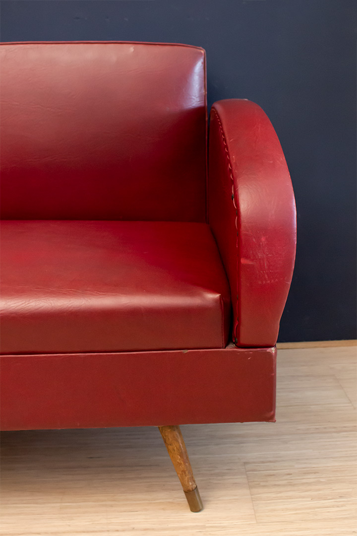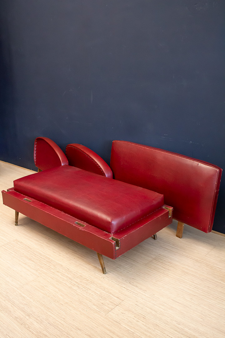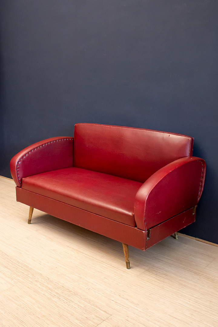 Leuk vintage bankje uitgevoerd in bordeauxrood skai-leer. Gemaakt in de jaren 60/70 en qua formaat perfect voor in een studentenkamer. Met schuine houten pootjes en afgewerkt met metalen meubelnagels. De zij- en achterleuning van het bankje zijn los te halen. Zo hou je een soort klein bedje over. Handig als poef of als logeerbedje voor een kindje!