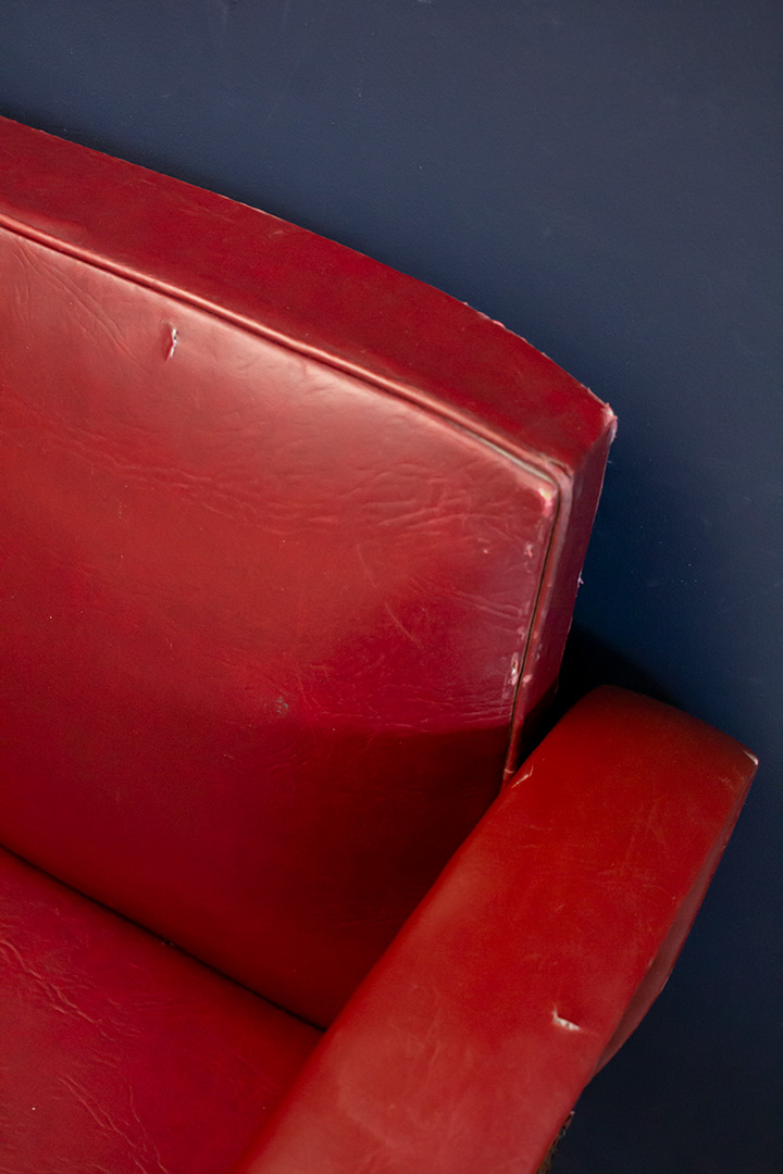 Het bankje heeft een relaxte zit en veert flink als je erop gaat zitten. De vering en constructie zijn nog helemaal in orde. Het skai-leer heeft echter met de jaren wat beschadigingen opgelopen (zie foto’s). Er is wat speling in de leuningen, omdat je die er zo uit kunt klikken. Al met al een karakteristiek vintage bankje om nog een tijdlang plezier van te hebben!
