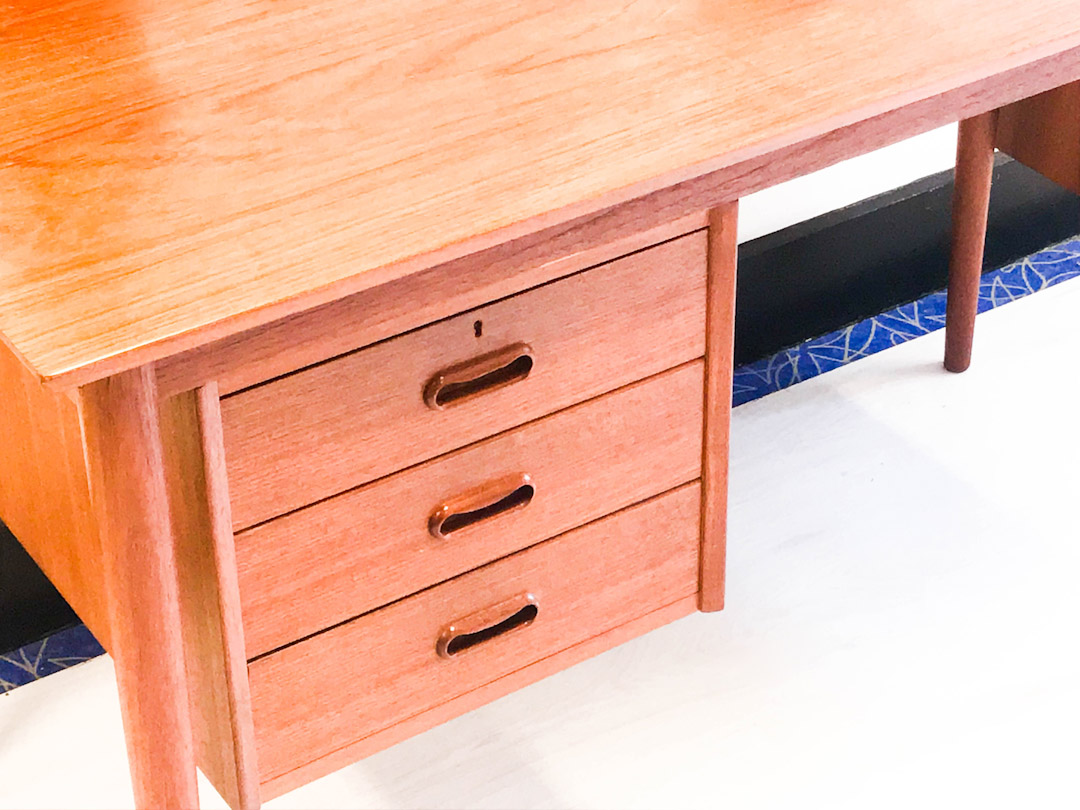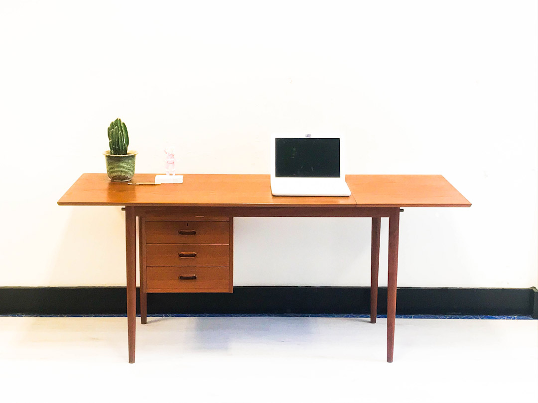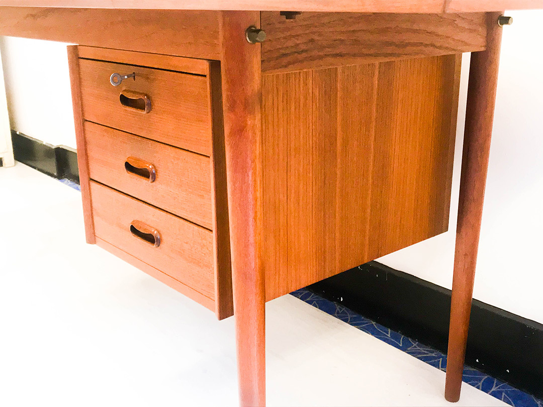 Dit fraaie vintage bureau is ontworpen door de Deense designer Arne Vodder, in opdracht van de fabrikant Sigh & Søns Møbelfabrik A\S. Het bureau is uitgevoerd in teakhout fineer en verkeert nog in een zeer goede staat. Het ladeblok bestaat uit 3 lades, die van links naar rechts kunnen worden verschoven. Nog een handigheidje aan dit bureau is het verlengbare bureaublad, dat aan de zijkant hangt en indien nodig voor een groter werkblad kan worden uitgeklapt. Hiervoor schuif je het originele blad helemaal naar de andere kant en wordt het weer één geheel.