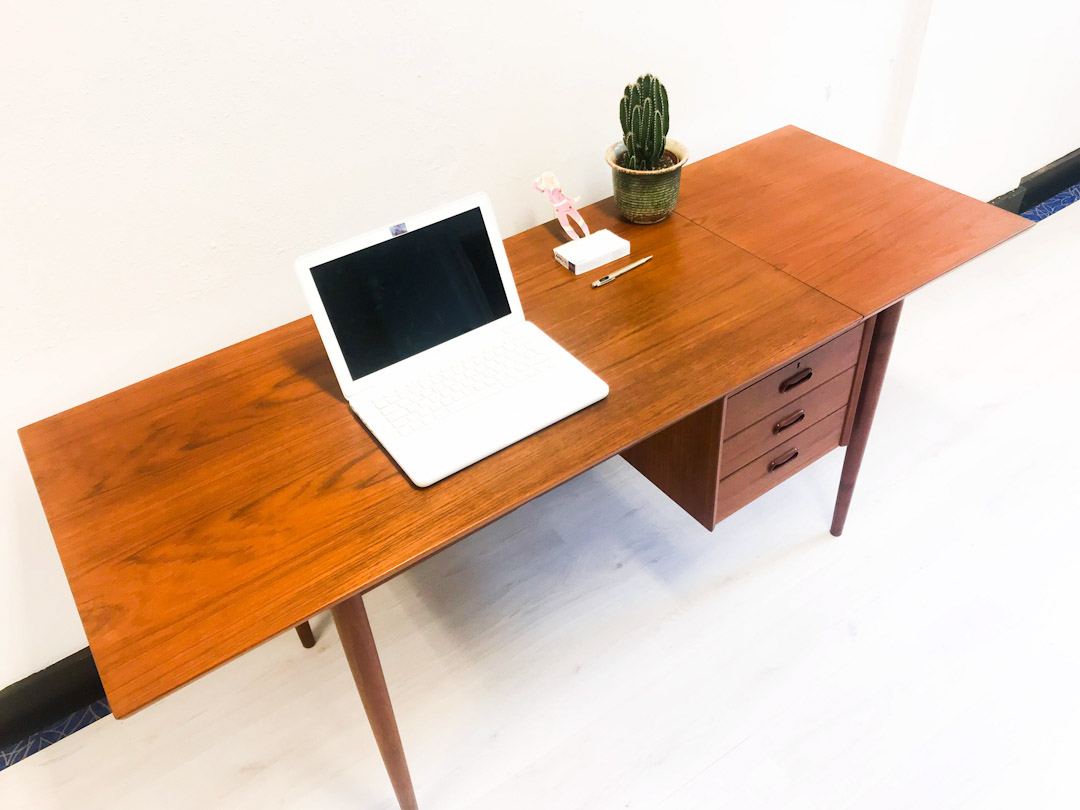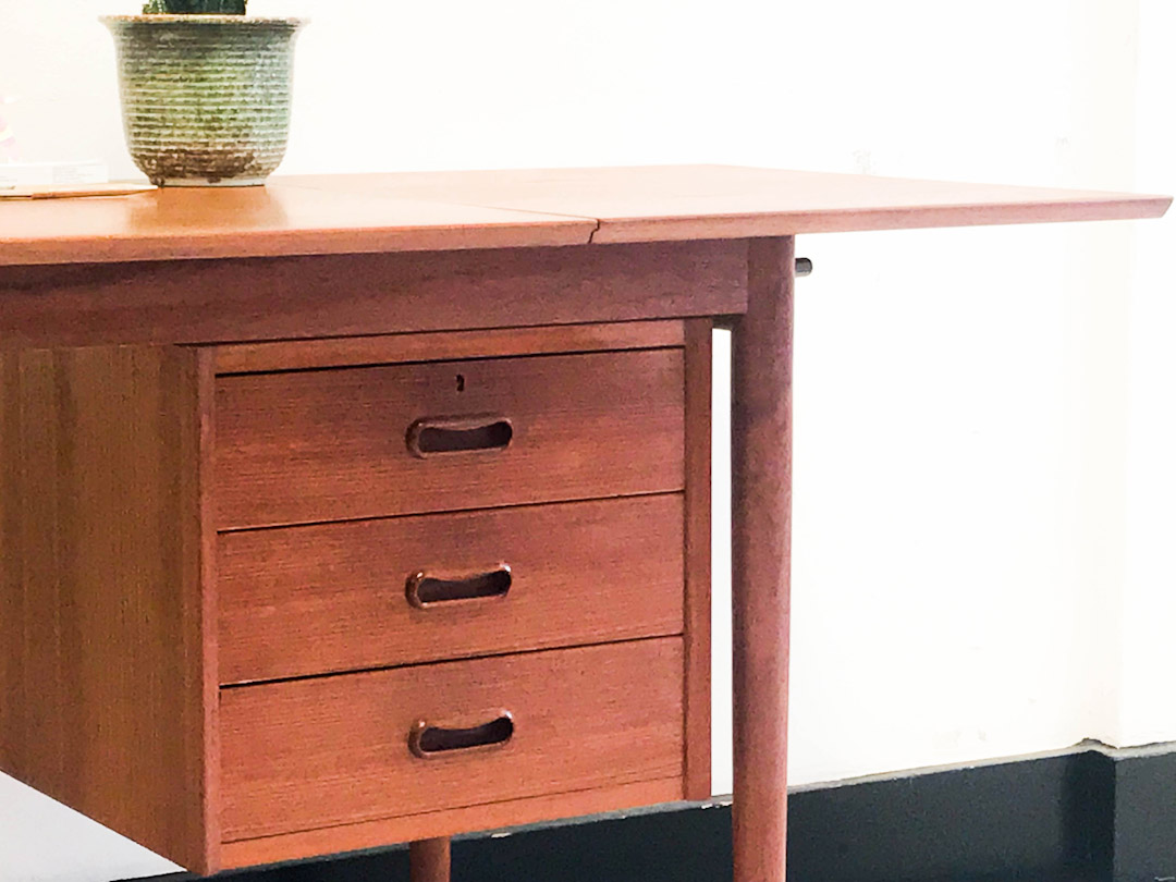 Arne Vodder vintage bureau van teakhout fineer met inklapbaar blad Deens design uit de jaren ’60
