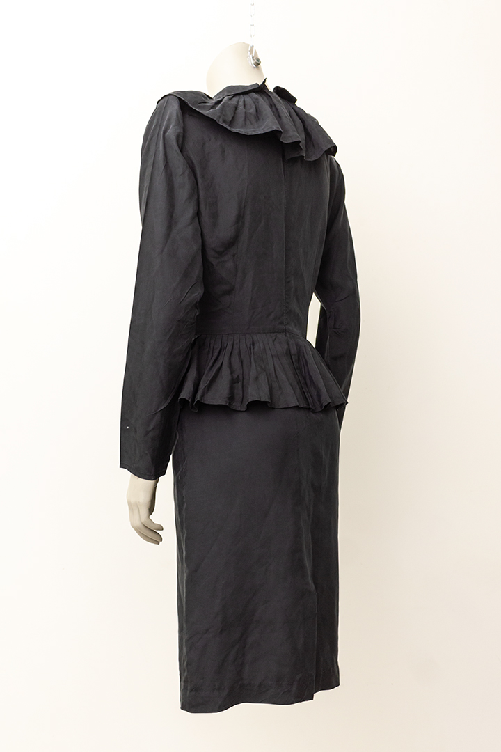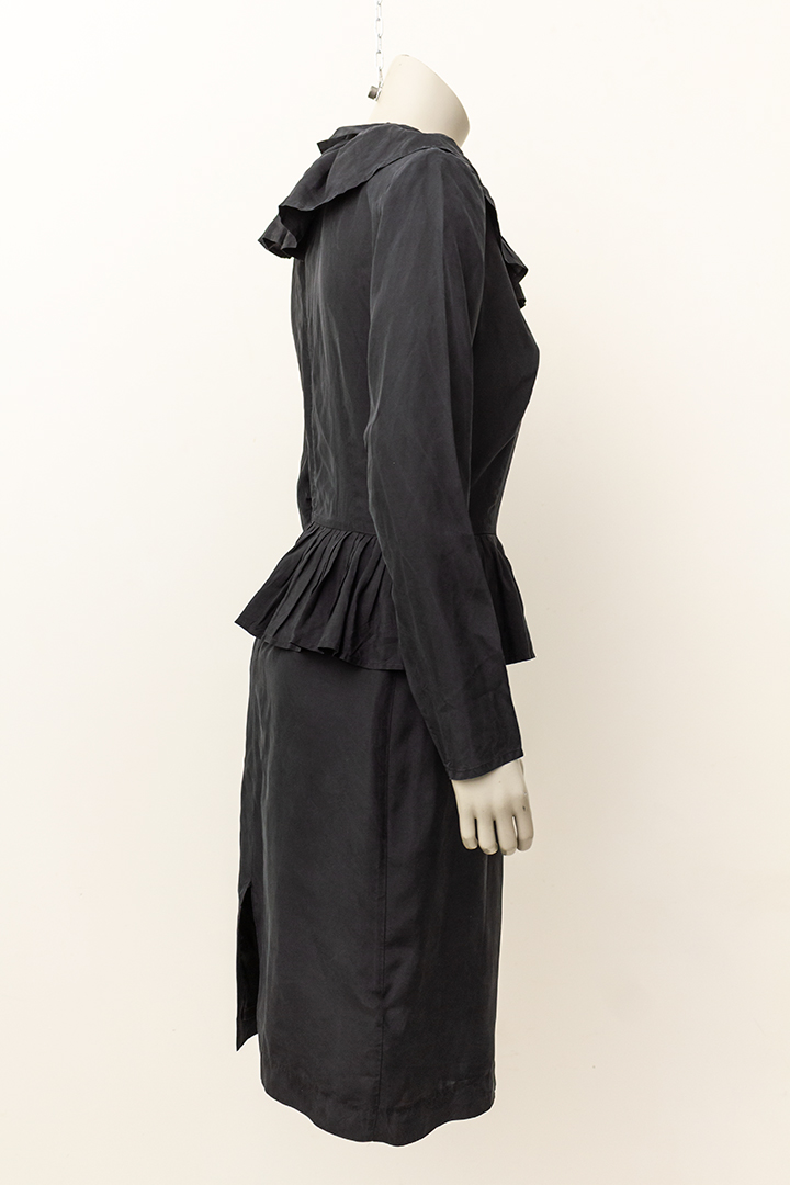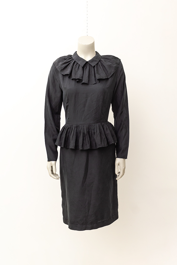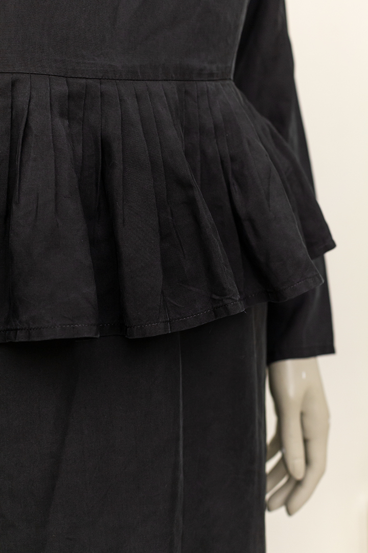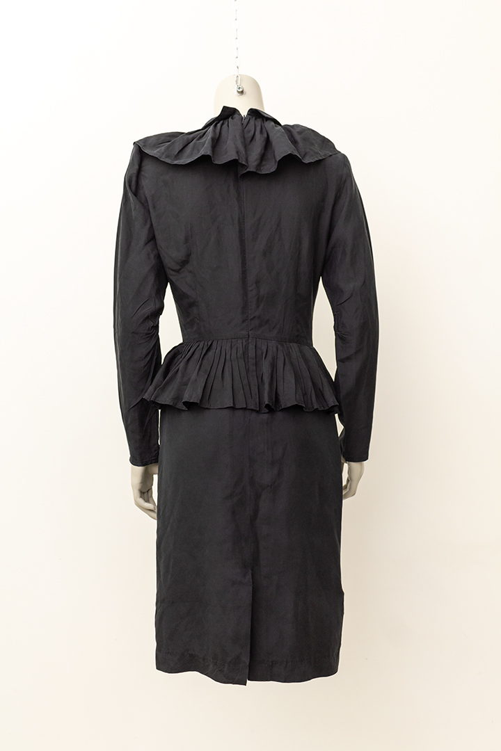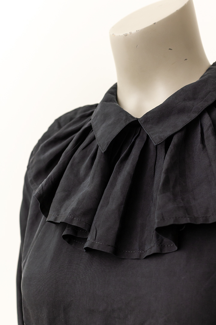 De grote geplisseerde kraag van deze jurk loopt helemaal door naar achteren. Hetzelfde geldt voor de kleinere kraag die daarop bovenop ligt en de rushes rond de taille. De jurk heeft coupenaden aan de voor- en achterkant. Het item sluit met een lange rits aan de achterzijde en heeft daar een kleine split. De zwarte stof is ietsje shiny.
