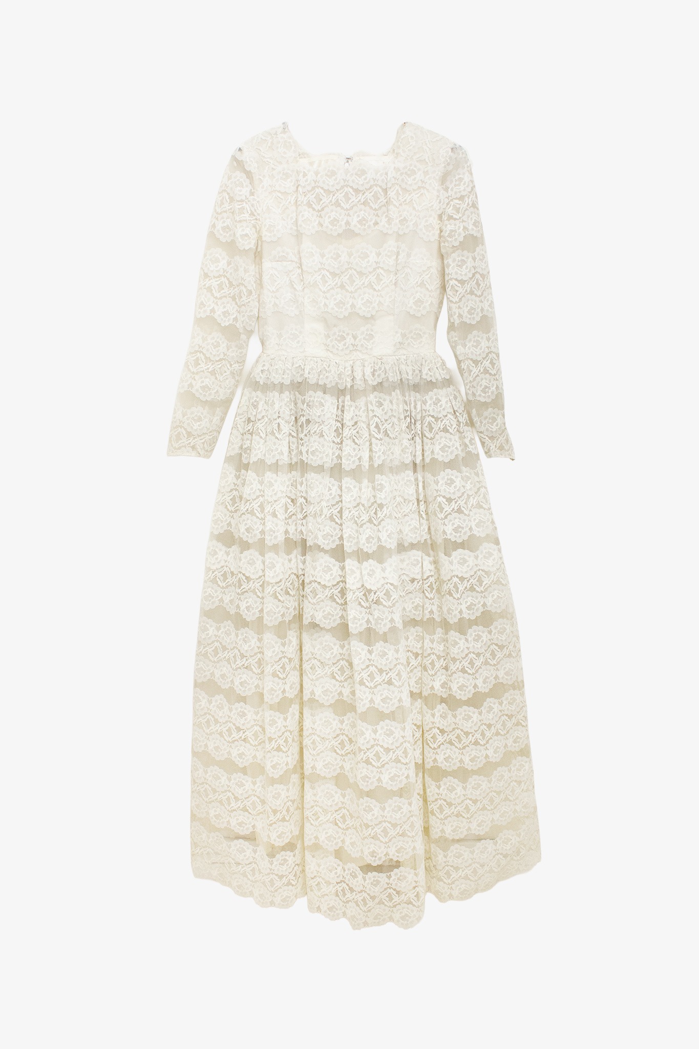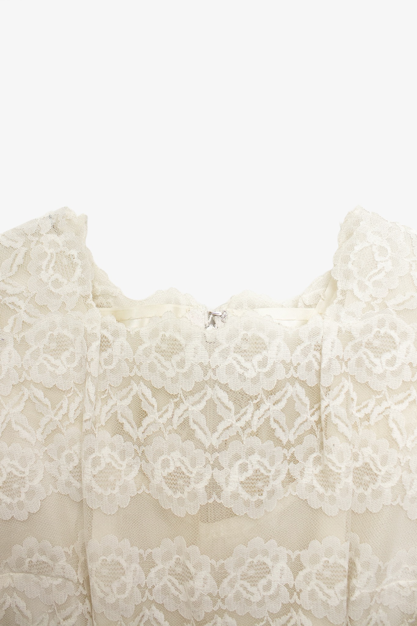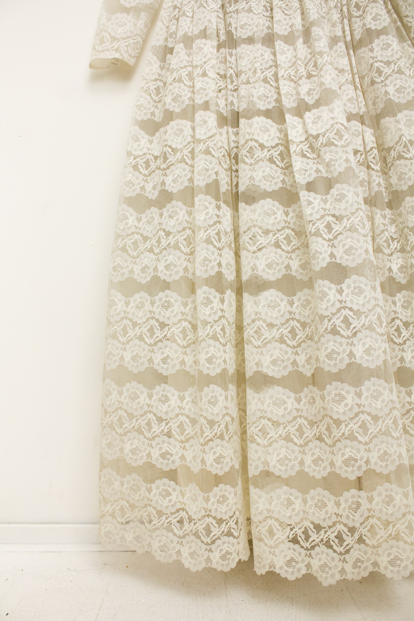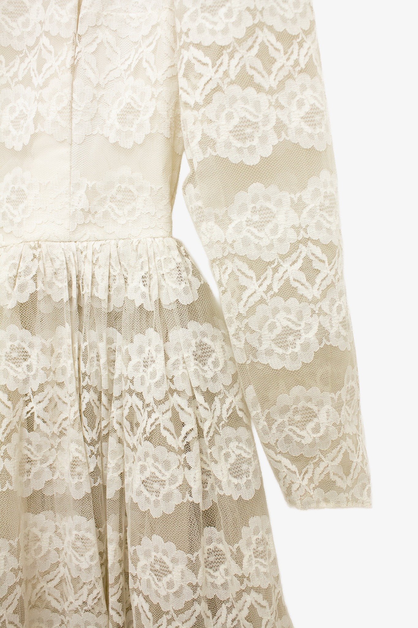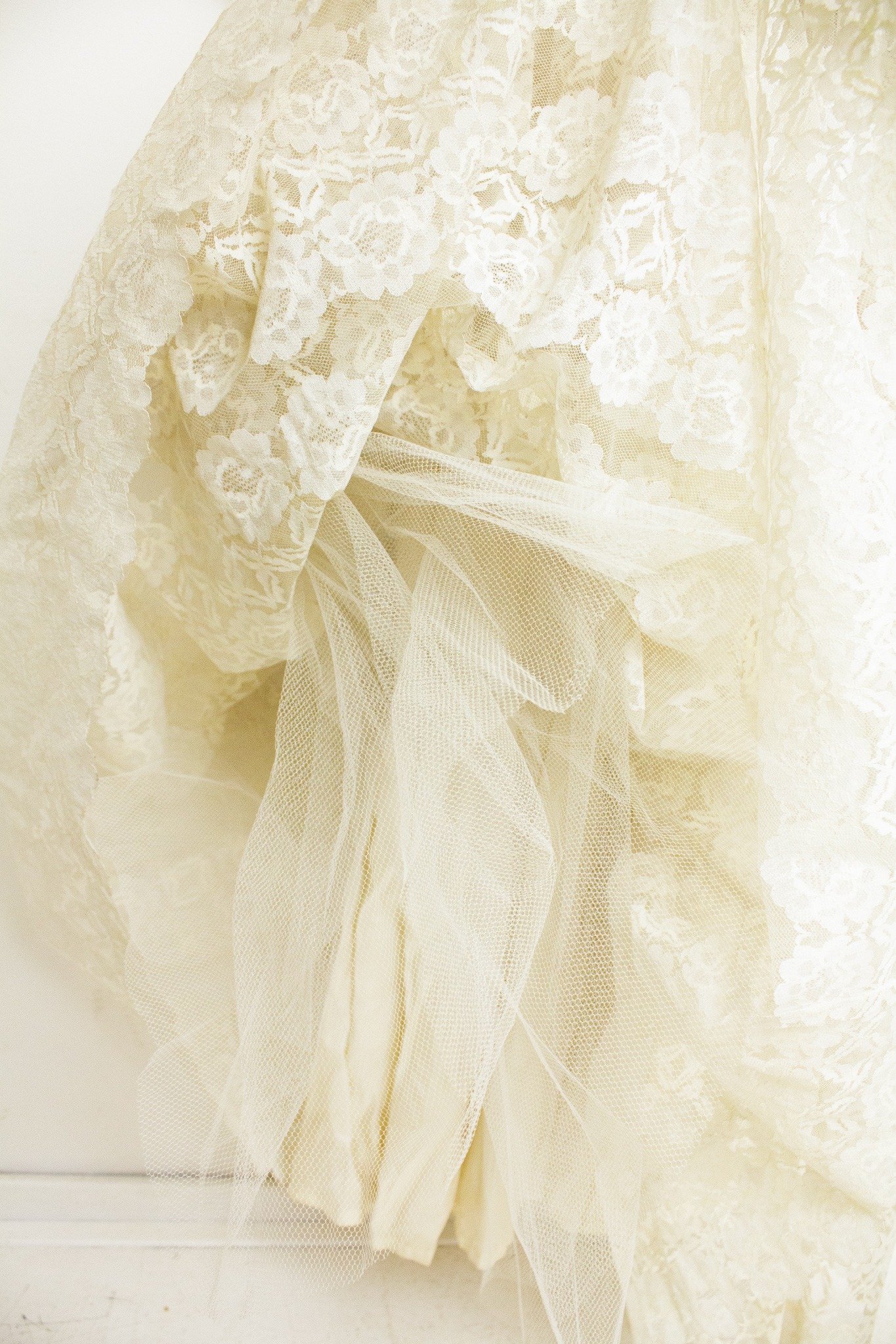 Door de stevige, hoge kwaliteit van het kant blijft de jurk prachtig in model, zowel staand, zittend als bewegend. Onder de rok zijn verschillende lagen tule aangebracht wat de jurk een prachtig majestueus volume geeft. De bovenzijde van de jurk heeft een crèmekleurig onderlijfje en gaat hiermee naadloos samen met het kant. Doordat het onderlijfje niet meeloopt in de mouwen, krijgt de jurk een luchtige, romantische uitstraling. De jurk sluit met een blinde rits op de rug die loopt van de gerimpelde taille tot de op vorm geknipte kanten halslijn.