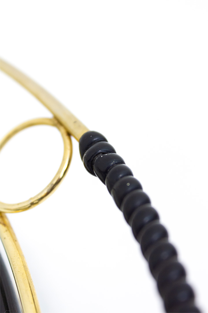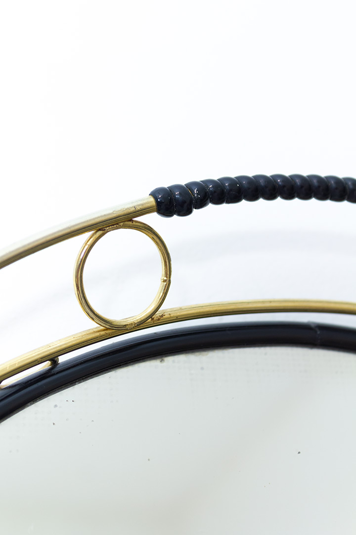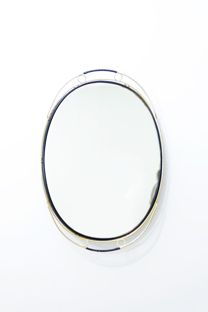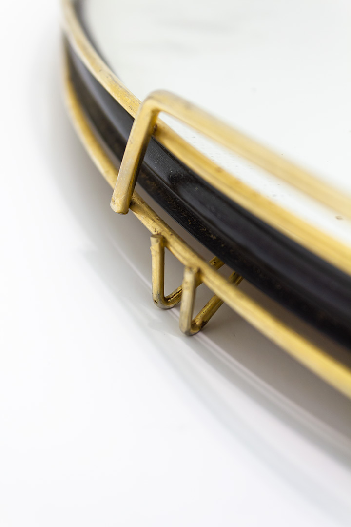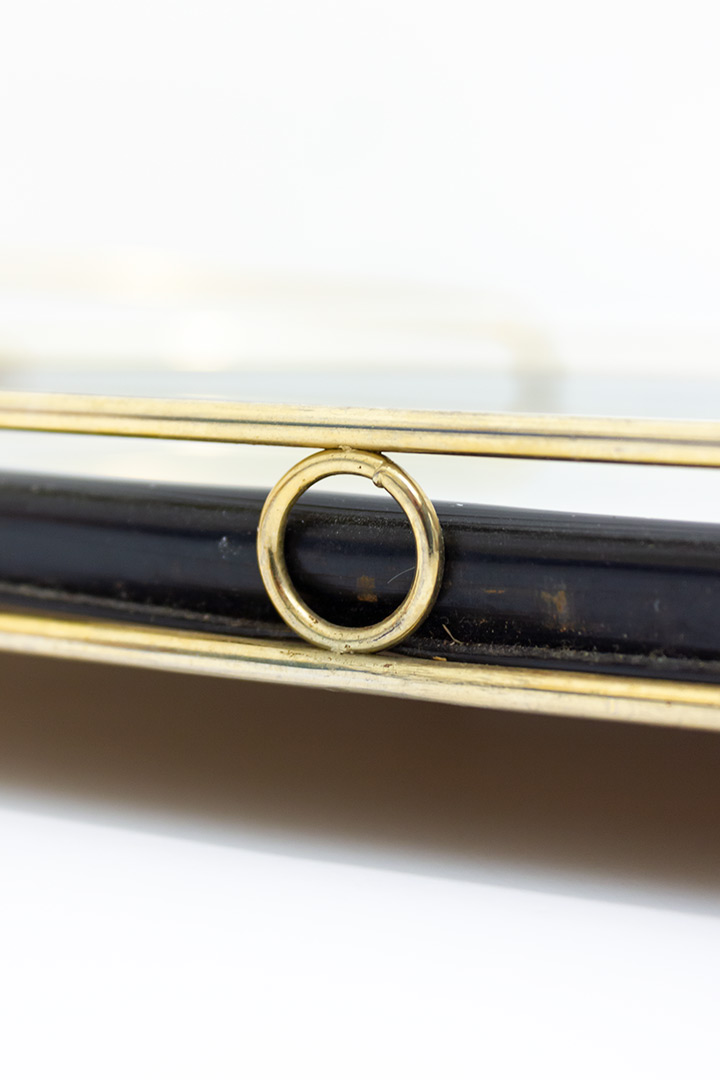 Dit vintage item houdt het midden tussen een dienblad of ovale spiegel. Het glazen oppervlak is omlijst door een sierlijk messing frame. Twee zwart omwikkelde handvatten geven extra detail.